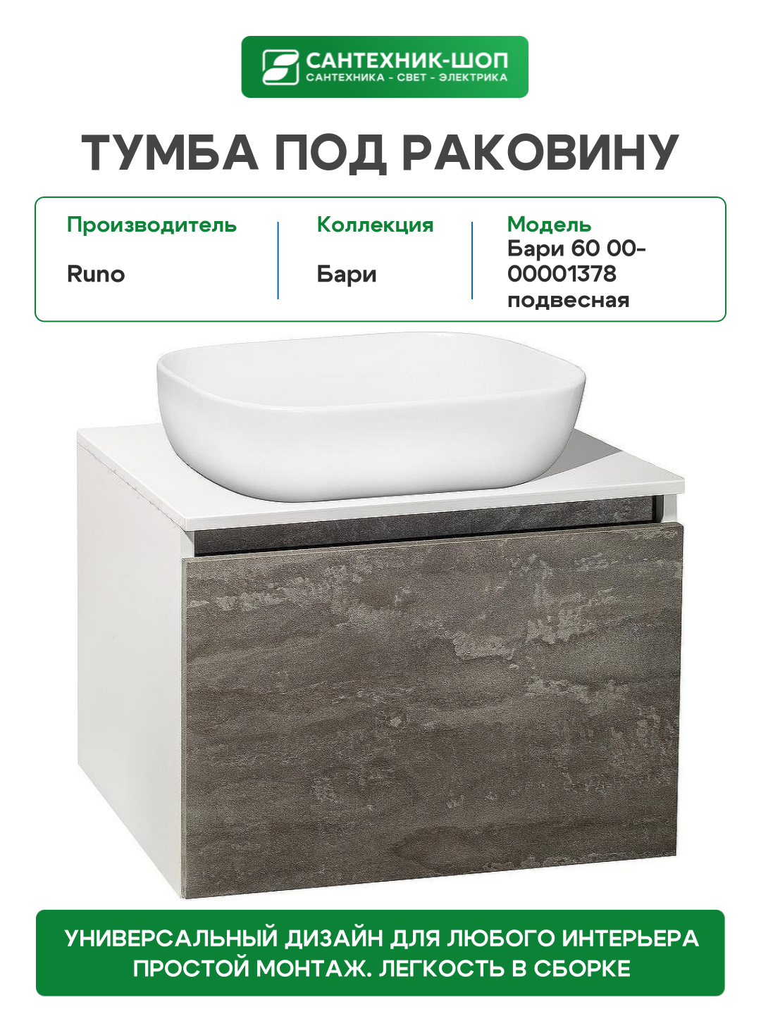 | Дополнительная информация | Высота в характеристиках указана тумбы вместе с раковиной. Габариты тумбы и раковины по отдельности представлены в галерее карточки товара. Форма поставки - в собранном виде. |