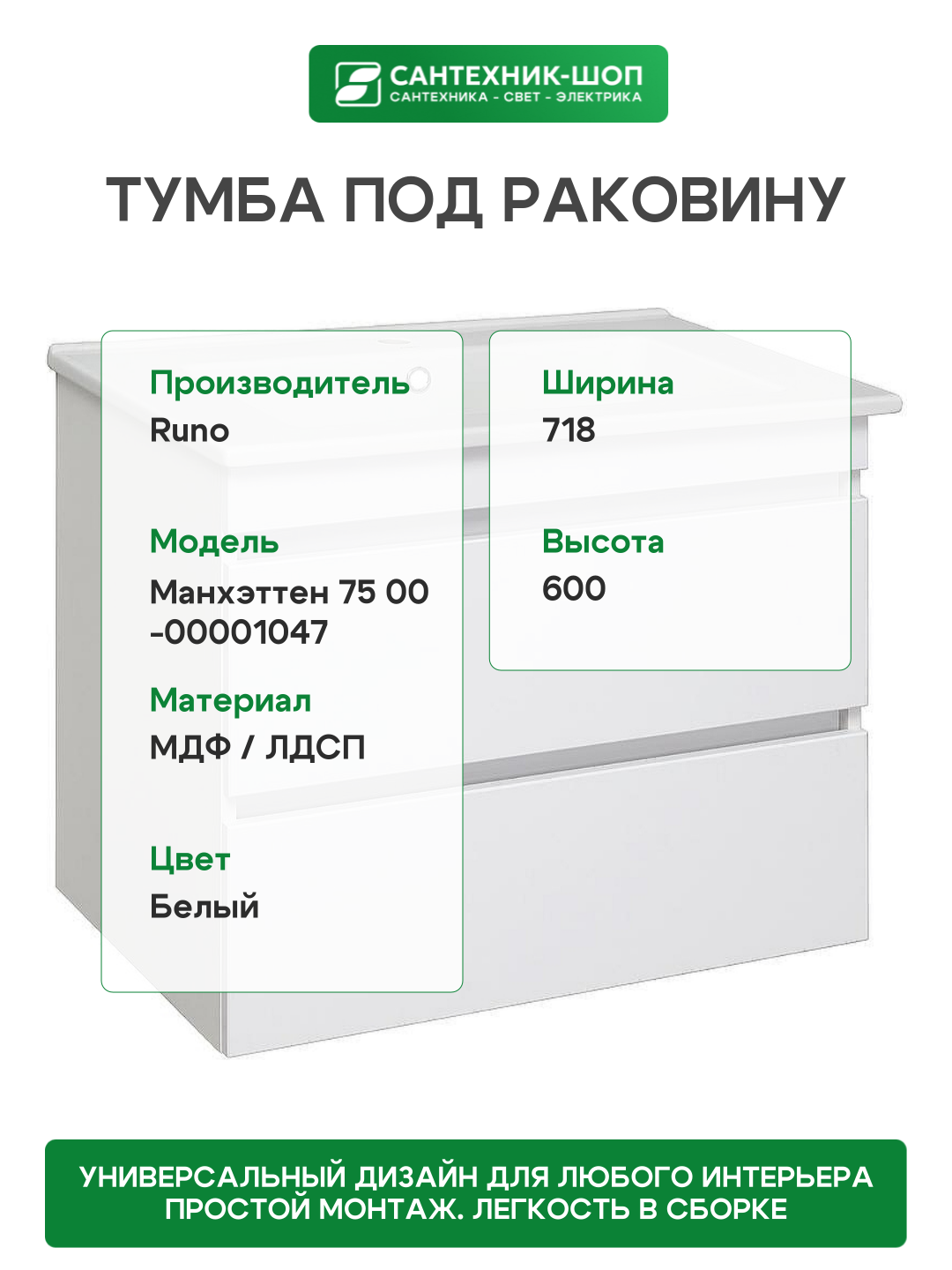 Тумба под раковину Runo Манхэттен 75 00-00001047 Белая МДФ / ЛДСП: сравнение цен, характеристики, фото, актуальное наличие и цены.