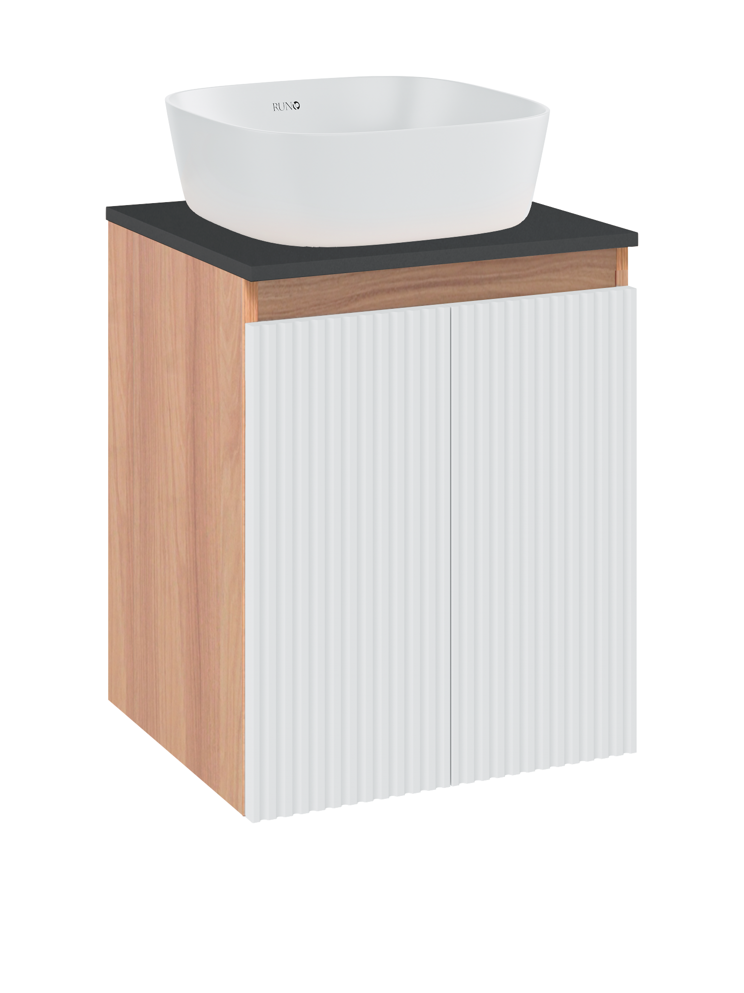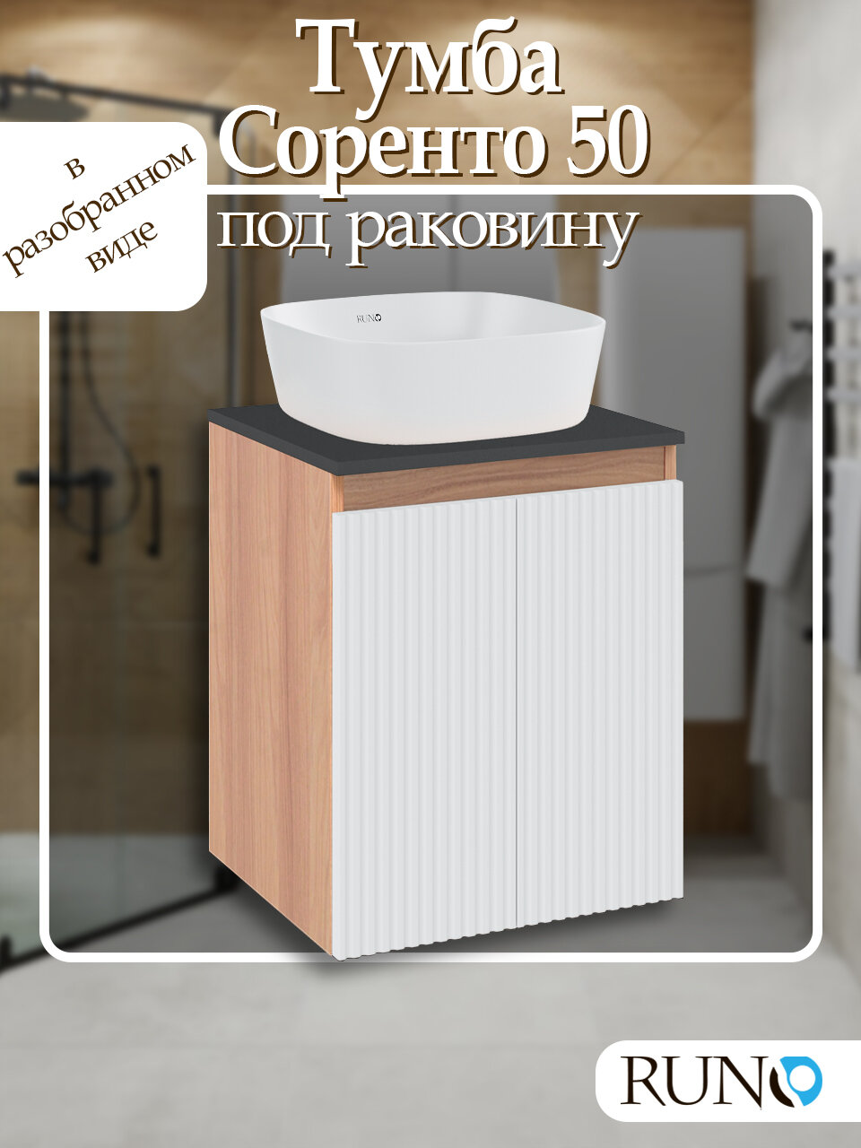Тумба под раковину RUNO Соренто (подвесная) - отличное решение для современного оформления интерьера Вашего дома. Нашей командой дизайнеров, было разработано оригинальное сочетание цветов тумбы под раковину, которые сочетают в себе все благоприятные цвета, а также пользуются постоянным спросом – это три цвета модных и классических оттенков: крафтовый дуб (корпус) – бежевый цвет, который ассоциируется с естественностью и натуральностью; графит (столешница) – серый цвет, олицетворяющий – стабильность; традиционный и всегда модный белый цвет (фасад) – акцентирует сознание на чистоте и невинности, а волнистые рифленые фасады визуально «оживят» и «приведут в движение» всю обстановку комнаты, сохраняя при этом умиротворение и покой. Тумба для ванной комнаты гармонично впишется в любой интерьер. Благодаря сочетанию трёх цветов тумбу подвесную под раковину можно комбинировать с другими шкафами и пеналами наших коллекций Соренто и Лада. К тумбе подходят накладные раковины разнообразных форм, дизайнов и размеров. Например такие модели как: Cristallo, PALLA, TERZO. Cristallo (50х40 см) – идеальное решение для стильного интерьера ванной, умывальник создан для минималистичных интерьеров и подойдёт для санузлов в стиле лофт, минимализм и хай-тек. Симетричная восьмиугольная форма раковины с высеченными гранями напоминает собой кусок горного необработанного хрусталя. Такая форма усиливает идею индивидуальности в дизайне ванной комнаты (артикул - 5767627567); PALLA D41 (диаметр 41см) - идеальное решение для стильного интерьера ванной, создан для минималистичных интерьеров и подойдёт для санузлов в стиле лофт, минимализм и хай-тек. Строгая круглая геометрически правильная форма раковины, усиливает идею лаконичности в дизайне ванной комнаты (артикул - 4217774203); TERZO 60 (59х39см) - идеальное решение для стильного интерьера ванной, создан для минималистичных интерьеров и подойдёт для санузлов в стиле лофт, минимализм и хай-тек. Асимметричная раковина, которую можно установить любой стороной, дизайнерское решение для нестандартных интерьеров, усиливает идею неповторимости в дизайне ванной комнаты. Тумба под раковину поставляется в разобранном виде, в комплект входят: боковины тумбы левая и правая, верхняя (столешница) и нижняя части тумбы, полка, дверцы, заднее и переднее ребра жёсткости, петли (две с доводчиком, две без доводчика), навесы тумбы, набор комплектующих для сборки тумбы, инструкция по сборке. Мебель для ванной Руно - красота и практичность в мелочах! Цвет товара на мониторе может отличаться от реальных цветов, это зависит от настроек цветового профиля и разрешения Вашего монитора или мобильного устройства.
