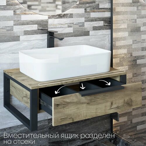 Тумба под раковину в стиле лофт в цвете Дуб Крафт Золотой – это сочетание насыщенного древесного декора и благородства металла. Тумба для ванны имеет преимущество - современный дизайн без лишних деталей и вместительный ящик, разделенный на функциональные отсеки для дополнительного удобства хранения. Тумба в ванную дополнена металлическими кронштейнами, которые используются как рейлинги. Тумбочка для ванной легко и беззвучно открывается небольшим нажатием на ящик. Оригинальная ручка идеально сочетается с металлическими черными профилями и полотенцедержателем. Преимущества модели: - прочный каркас: металлические навесы выдерживают нагрузку до 100кг; - кронштейны возможно использовать как держателя для полотенец.