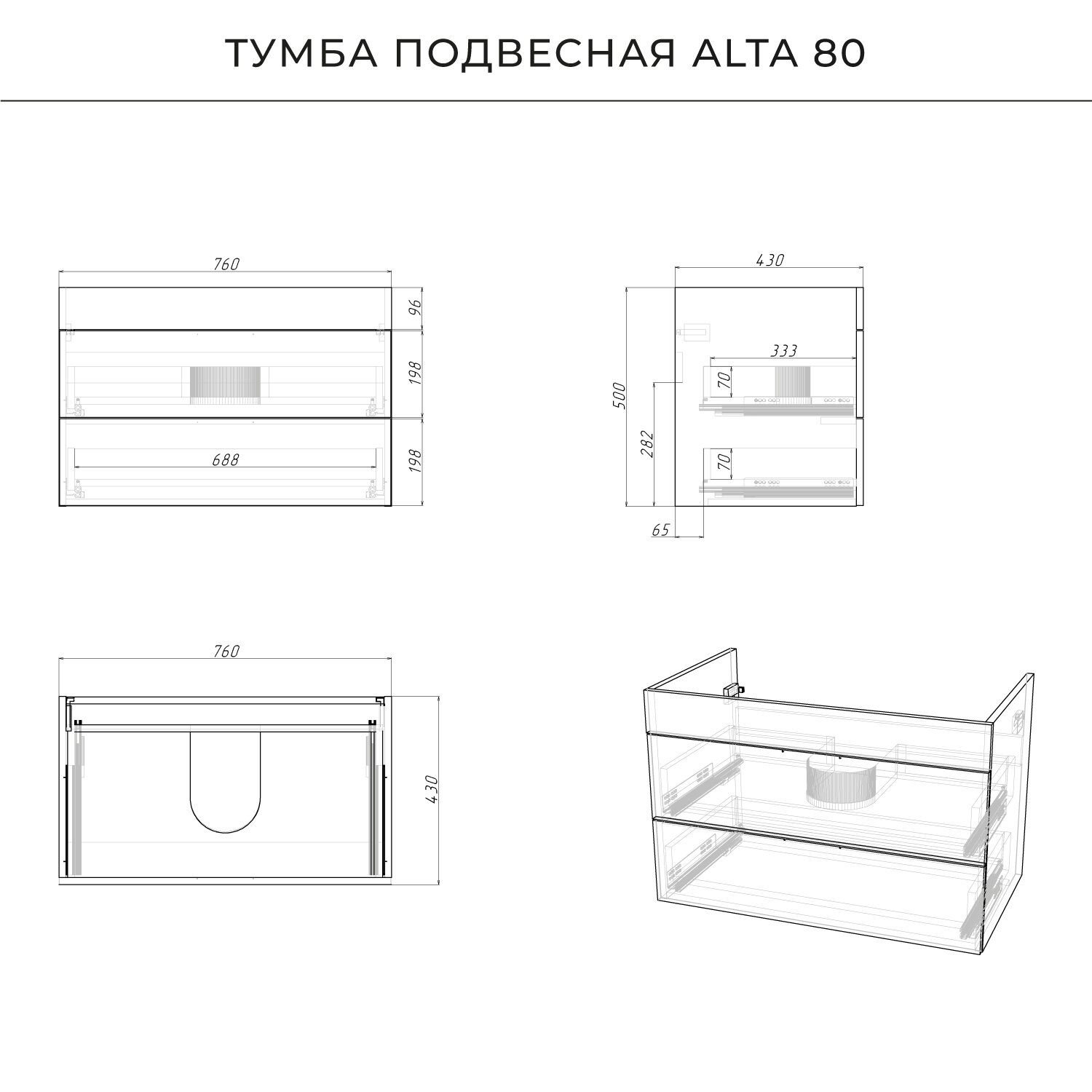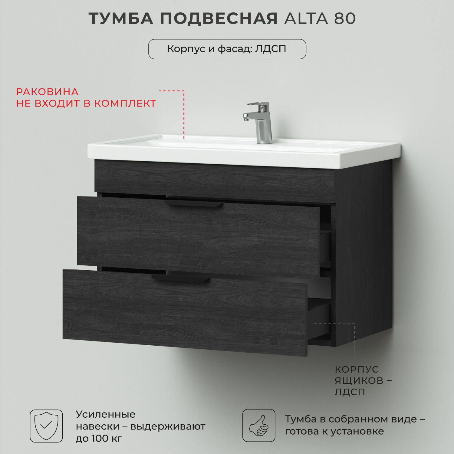 Подвесная тумба под раковину из коллекции Alta - это сочетание природного декора и благородства металла. Современные материалы из которых изготовлена тумба для ванной, обладают повышенной влагостойкостью. Материал корпуса и фасадов тумбы для ванной из ламинированного ДСП. Качественная фурнитура с доводчиками обеспечивает легкое открывание и плавное закрывание ящиков и дверок. Вырез под сифон универсальный, для любого типа. Благодаря своей конструкции тумба обеспечивает удобный доступ к раковине и позволяет скрыть коммуникации. Тумба с раковиной в ванную оснащена удобными ящиками для хранения, что позволяет разместить всё необходимое под рукой. Дополнить комплект можно зеркальным шкафом, пеналом или стеллажом. Для точного выбора тумбочки под раковину в ванную комнату рекомендуем обратиться к схеме замеров, которая находится на фото в карточке товара, размеры изделия могут отличаться +/-1 см в связи со спецификой производства. Тумба для ванной доставляется в предварительно собранном виде, надежно упакована. Изделия коллекции качественные, функциональные и органически впишутся в популярные и современные интерьерные решения для ванных комнат. Тумба под раковину совместима с умывальником мебельным Kirovit "Фостер-800" и Cersanit COMO-80.