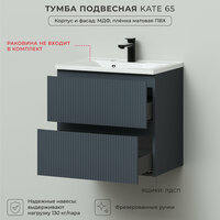Коллекция Kate - воплотила в себе тренд на фактурные фасады. Идеальный "рубчик" - простое и стильное дизайнерское решение для декорирования фасадов - эта мебель бесспорно станет украшением современной ванной комнаты. Подвесная тумба для ванной выполнена из МДФ и покрыта ПВХ пленкой, что делает её устойчивой к влаге, а значит долговечной. Удобные фрезерованные ручки, качественная фурнитура с доводчиками, вместительность - мы продумали все, чтобы тумба под раковину была не просто красивой, но еще и функциональной, приятной в использовании. Благодаря своей конструкции тумба обеспечивает удобный доступ к раковине и позволяет скрыть коммуникации. Вырез под сифон универсальный, для любого типа. Тумба под раковину в ванную оснащена удобными ящиками для хранения, что позволяет разместить всё необходимое под рукой. Для точного выбора тумбочки под раковину в ванную комнату рекомендуем обратиться к схеме замеров, которая находится в карточке товара, размеры изделия могут отличаться +/-1 см в связи со спецификой производства. Дополнить комплект можно раковиной для ванной Milena 65 и другими изделиями из коллекции Kate.