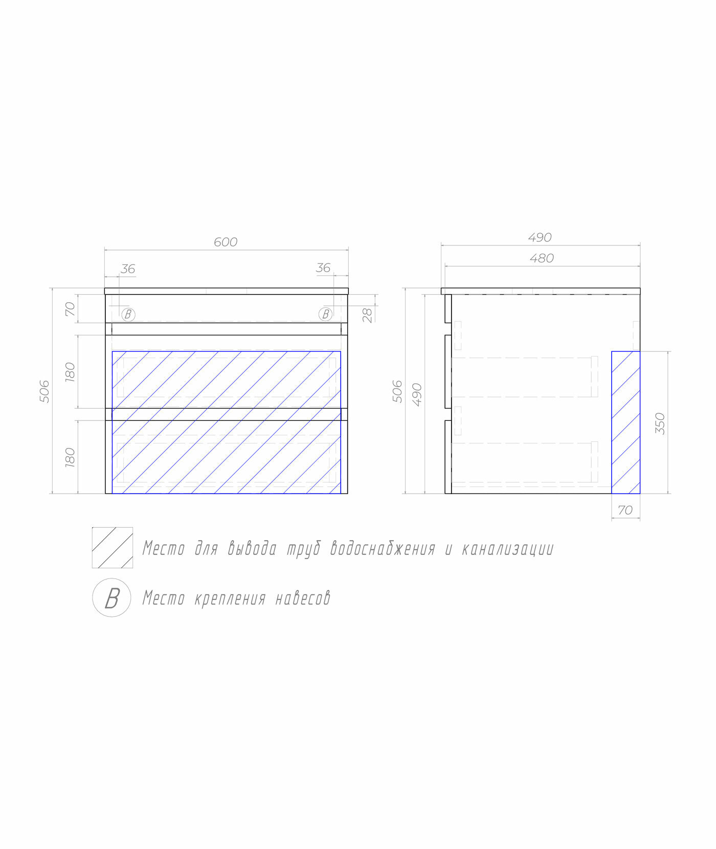 - Габариты корпуса тумбы (ШхГхВ): 60x49x50,6 см.