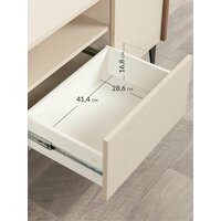 Напольная тумба оснащена вместительной полкой и ящиками для хранения. Закрытые шкафы с дверцами открываются нажатием, что добавляет удобства в использовании. Внутри можно разместить журналы, книги и другие аксессуары, сохраняя порядок в комнате. Открытая полочка станет отличным местом для декора, добавляя уют и стиль.
