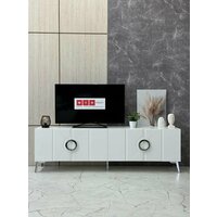 Тумба под ТВ "Ария" имеет современный минималистичный дизайн, который легко впишется в любой интерьер. Цвет тумбы - белый-серебристый, что придает ей элегантный вид.