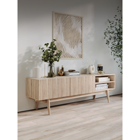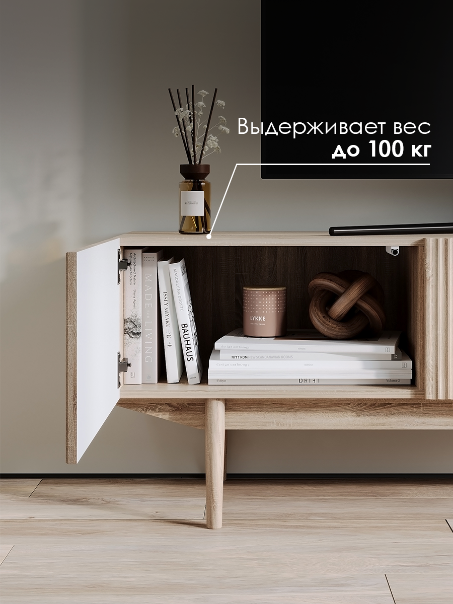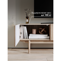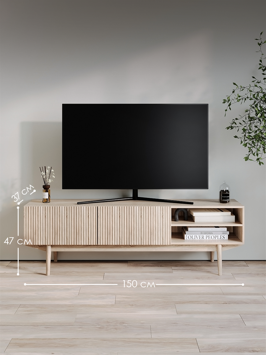 Тумба под телевизор Келли в стиле ретро с длинным прямоугольным корпусом. Это тонкая, но просторная тумба под телевизор с 2 дверцами и открытой нишей. Фасад декорирован деревянными выступами, благодаря которым фактурные элементы выглядят красиво. Ножки изготовлены из массива дерева.