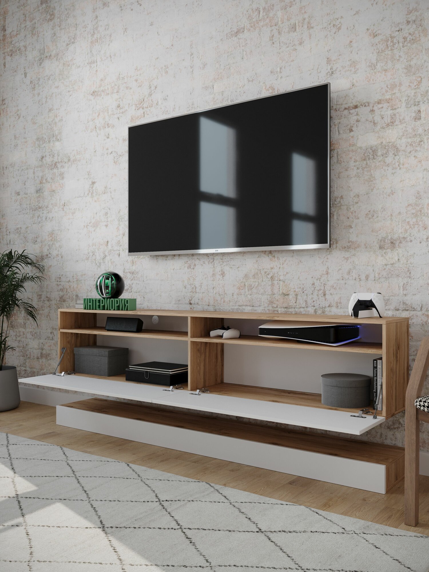 Подвесная тумба под телевизор TU-004 в современном стиле с длинным прямоугольным корпусом и дополнительной полкой. Дизайнерская тумба под телевизор TU-004 дополнена практичной полкой и стильной подсветкой. Современная подвесная тумба имеет два открывающихся фасада и две открытые полки. Дополнительная отдельно устанавливаемая полка может быть установлена на полу под основной тумбой или подвешена на стене. Фасад из высококачественного ЛДСП будет отлично смотреться в любом интерьере, а благодаря дополнительным полкам у вас будет быстрый доступ к необходимым вещам.