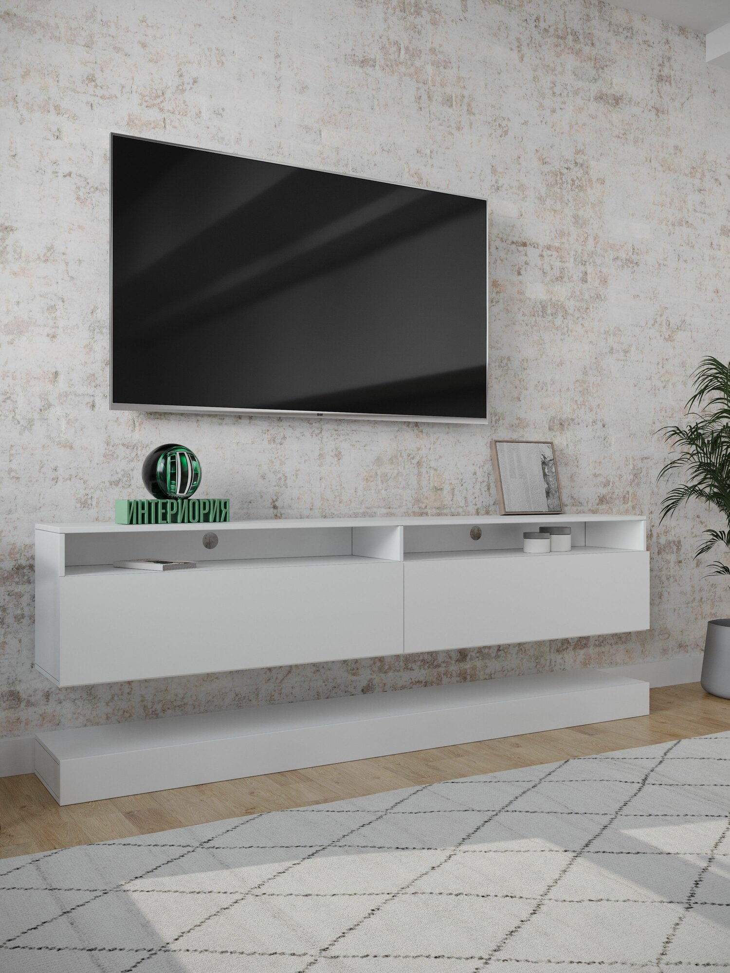 Подвесная тумба под телевизор TU-004 в современном стиле с длинным прямоугольным корпусом и дополнительной полкой. Дизайнерская тумба под телевизор TU-004 дополнена практичной полкой и стильной подсветкой. Современная подвесная тумба имеет два открывающихся фасада и две открытые полки. Дополнительная отдельно устанавливаемая полка может быть установлена на полу под основной тумбой или подвешена на стене. Фасад из высококачественного ЛДСП будет отлично смотреться в любом интерьере, а благодаря дополнительным полкам у вас будет быстрый доступ к необходимым вещам.