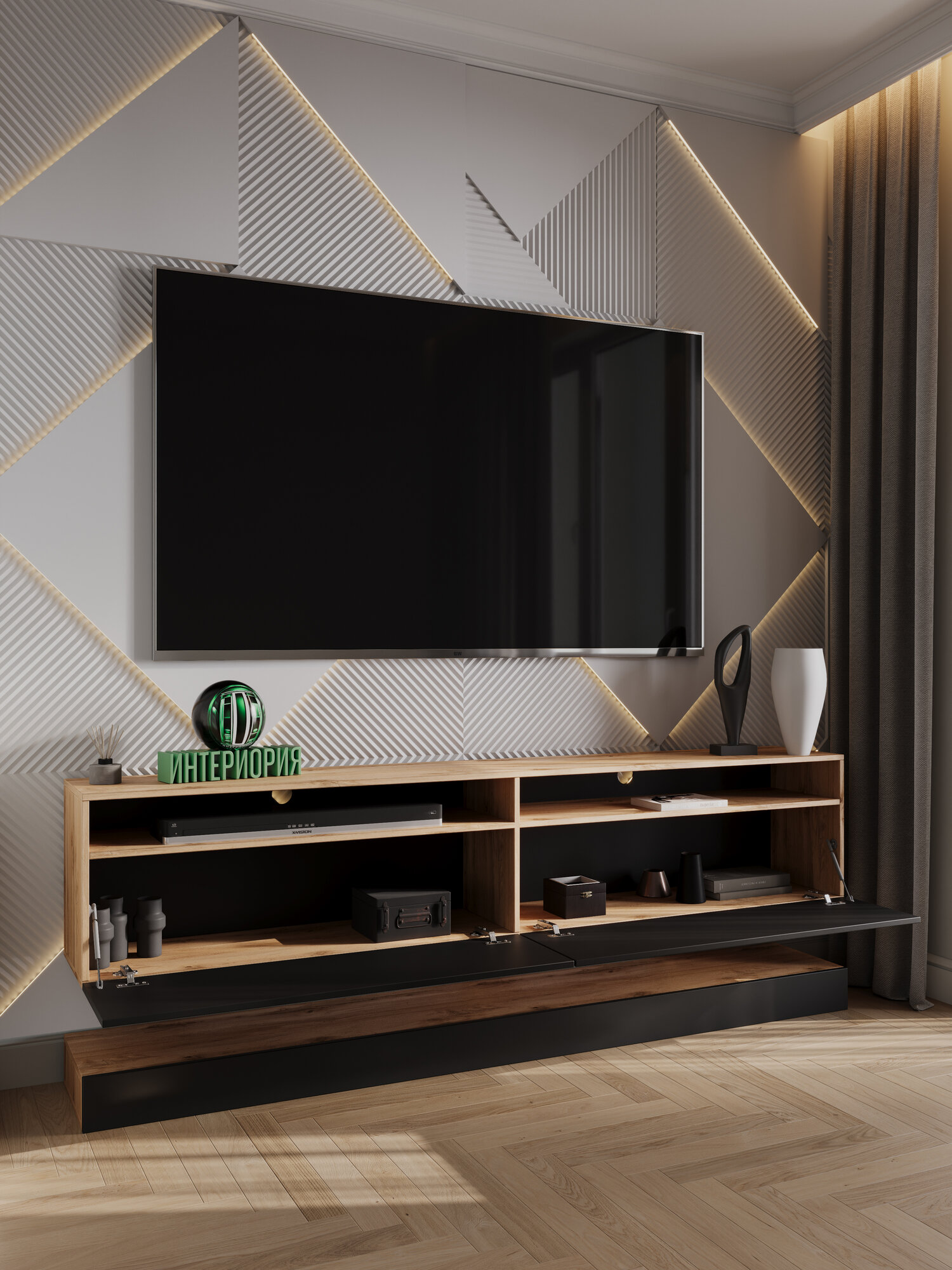 - Стильная тумба под ТВ впишется в современный, скандинавский, бохо, ретро, арт-деко интерьер