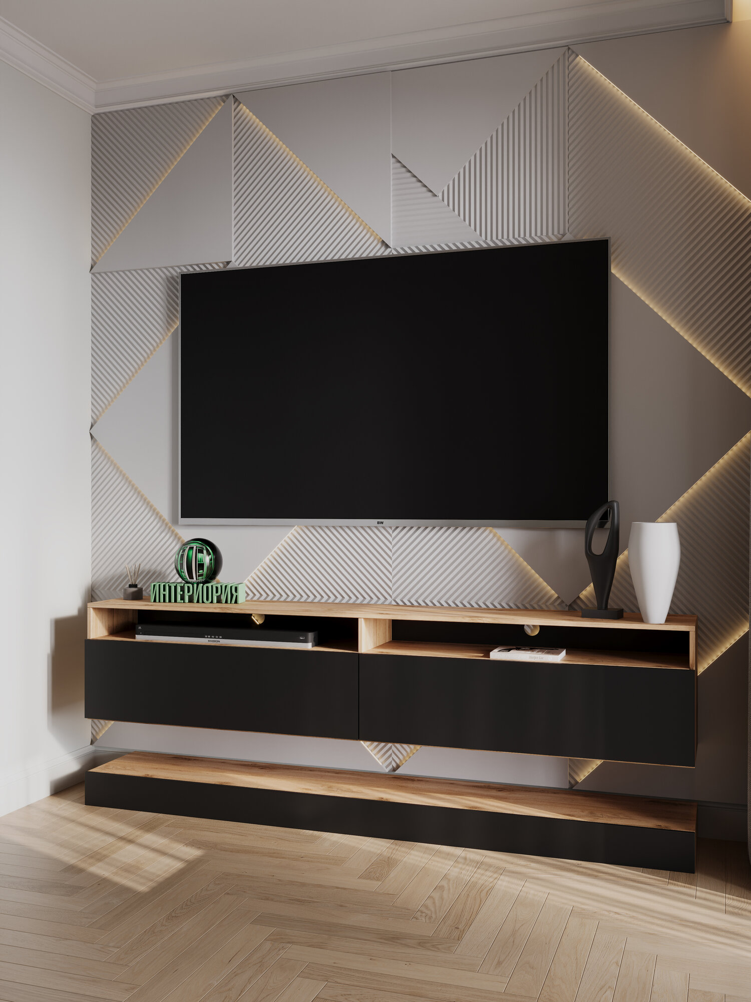 Подвесная тумба под телевизор TU-004 в современном стиле с длинным прямоугольным корпусом и дополнительной полкой. Дизайнерская тумба под телевизор TU-004 дополнена практичной полкой и стильной подсветкой. Современная подвесная тумба имеет два открывающихся фасада и две открытые полки. Дополнительная отдельно устанавливаемая полка может быть установлена на полу под основной тумбой или подвешена на стене. Фасад из высококачественного ЛДСП будет отлично смотреться в любом интерьере, а благодаря дополнительным полкам у вас будет быстрый доступ к необходимым вещам.