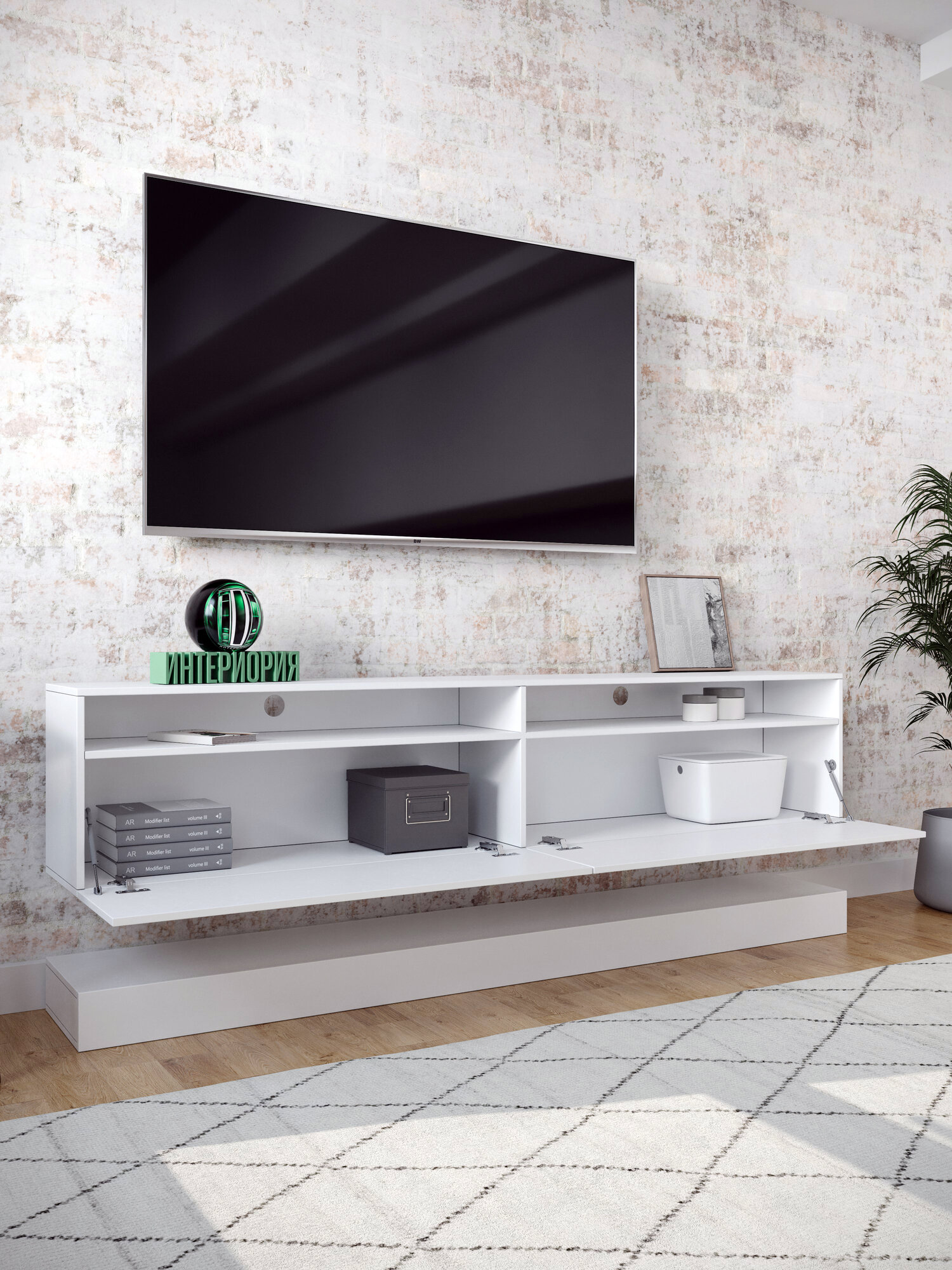 Тумба под телевизор подвесная с подсветкой в современном стиле с длинным прямоугольным корпусом и дополнительной полкой. Тумба дополнена практичной полкой и стильной подсветкой. Современная подвесная тумба имеет два открывающихся фасада и две открытые полки. Дополнительная отдельно устанавливаемая полка может быть установлена на полу под основной тумбой или подвешена на стене. Фасад из высококачественного ЛДСП будет отлично смотреться в любом интерьере, а благодаря дополнительным полкам у вас будет быстрый доступ к необходимым вещам.