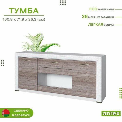 Коллекция: Оливия Глубина 36.3 см Ширина 160.8 см Высота 71.9 см Материал корпуса: ДСП ламинированная Материал фасада: ДСП ламинированная, МДФ, стекло Цвет корпуса: Вудлайн кремовый Цвет фасада: Дуб анкона Вариант доставки: В разобранном виде Объем: 0.108 м³ Стиль: Классический Фурнитура: Петли без доводчиков, Шариковые направляющие Ручки: Металлические Гарантия: 36 месяцев Фабрика: ANREX Страна производства: Беларусь Вес: 45.28 кг Количество упаковок: 2 ___________________________ Тумба под телевизор Оливия - сочетание современного дизайна и функциональности, делающее ее идеальным решением для организации пространства в гостиной. Модель Оливия дуб анкона RTV 1V2D1S предоставляет достаточно места для размещения телевизора, фоторамок, ваз с цветами и других декоративных элементов. Просторные открытые полки и выдвижные ящики обеспечивают удобное хранение аудио- и видеотехники, дисков, книг и журналов. Благодаря удобству использования и многофункциональности, эта длинная тумба станет центральным и стилообразующим элементом вашего гостиного пространства. Элегантный дизайн тумбы Оливия дуб анкона RTV 1V2D1S, с ее гармоничным сочетанием древесной текстуры и современных черт, позволит ей органично вписаться в интерьер в стилях классика или неоклассика. Эта функциональная и стильная тумба под телевизор станет практичным решением для рационального использования пространства в гостиной, дополняя ее уютную и гармоничную атмосферу. --------------------------------------- Преимущества нашего магазина: