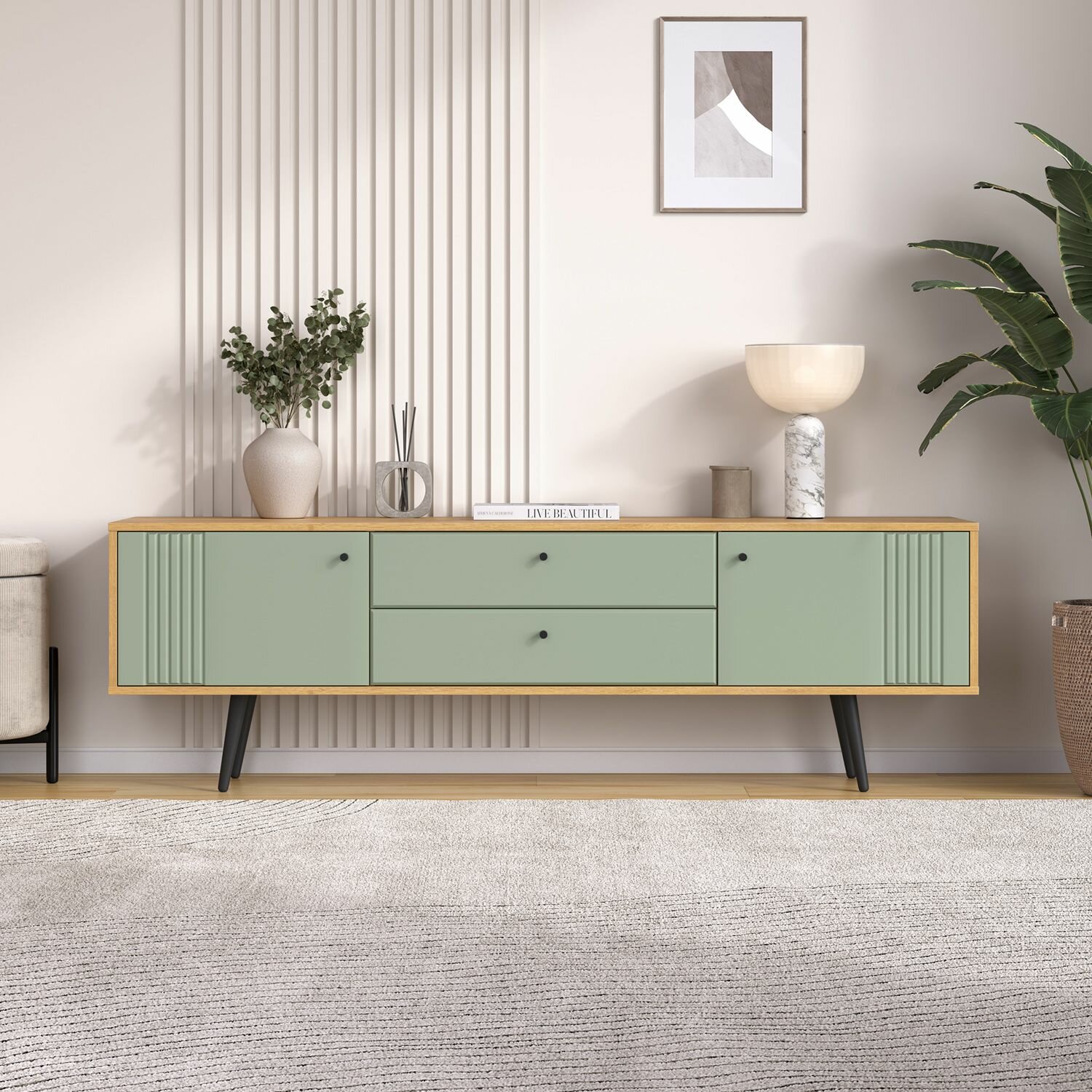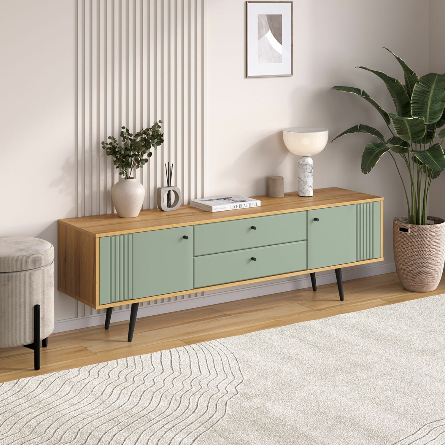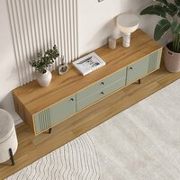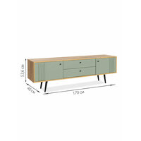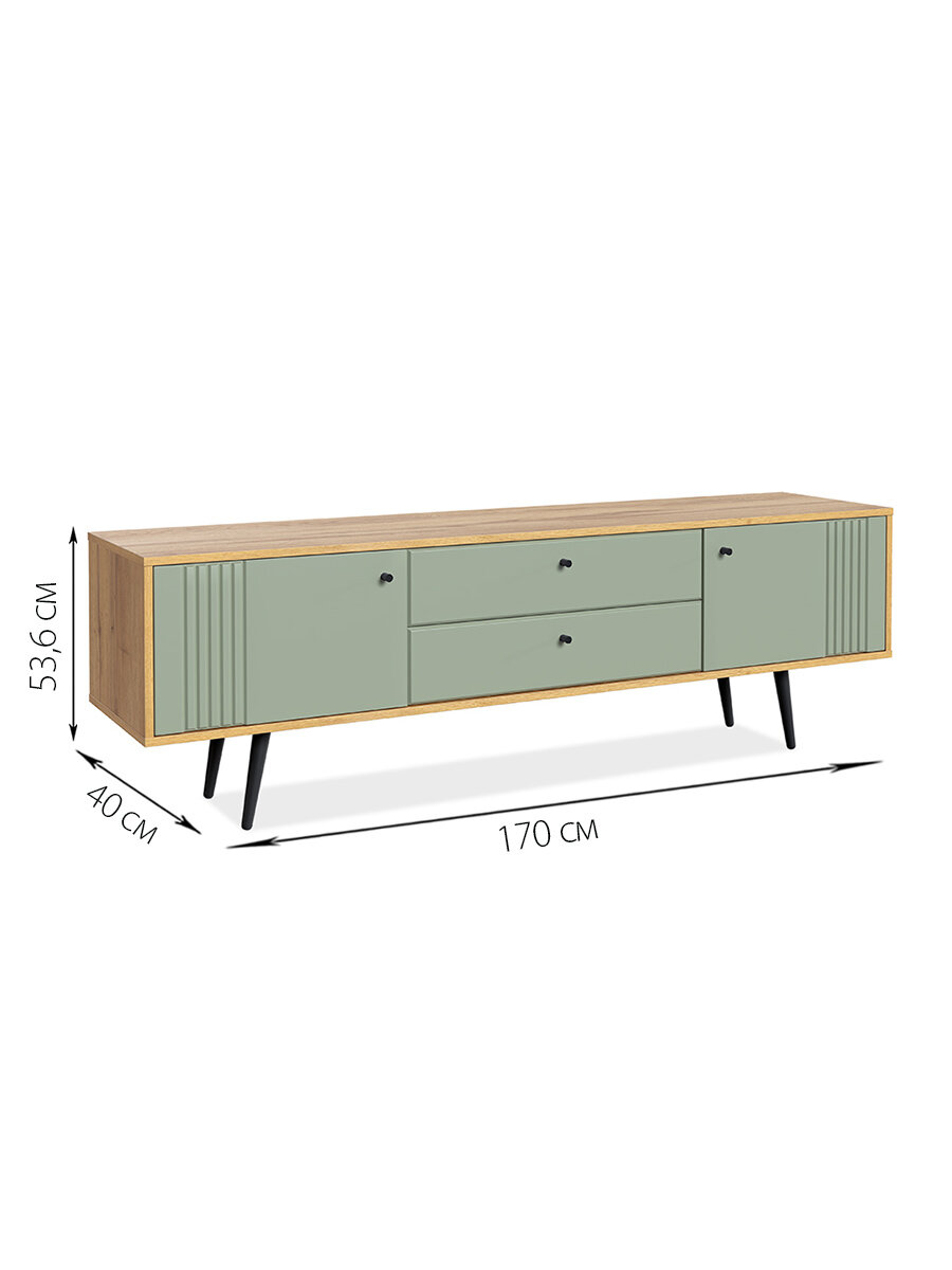 Тумба под ТВ 1700 в цвете дуб золотой и серо-зеленом станет стильным акцентом в любом интерьере. Эта напольная модель идеально подходит для установки телевизора, добавляя уюта и функциональности вашему пространству. Современный дизайн и качественные материалы делают эту тумбу не только красивой, но и долговечной.