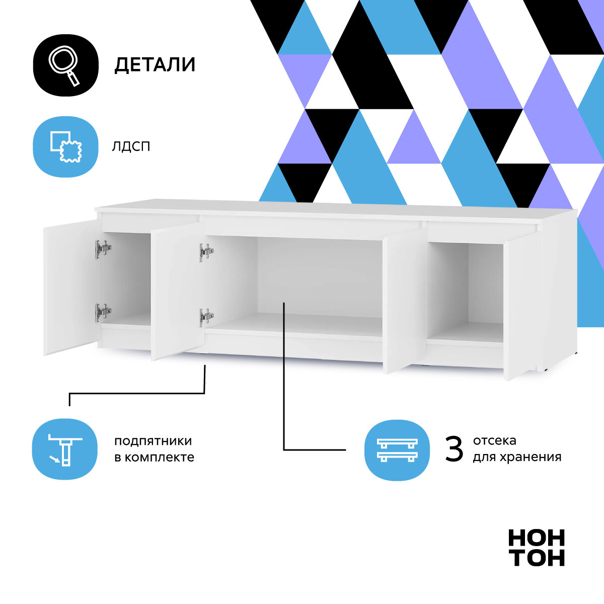 Тумба оснащена четырьмя распашными дверцами, которые обеспечивают удобный доступ к содержимому. Максимальная нагрузка на полку составляет 10 кг, что позволяет разместить на ней различные предметы, от книг до обуви.