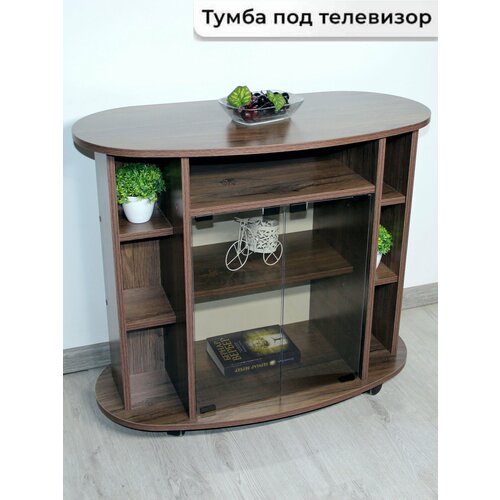 Мебель на колесных опорах- практичная и современная. Тумба на колесиках очень удобно перемещать по комнате, кода это необходимо. По бокам имеются маленькие полочки по 3 шт, также имеется полка за стеклом .