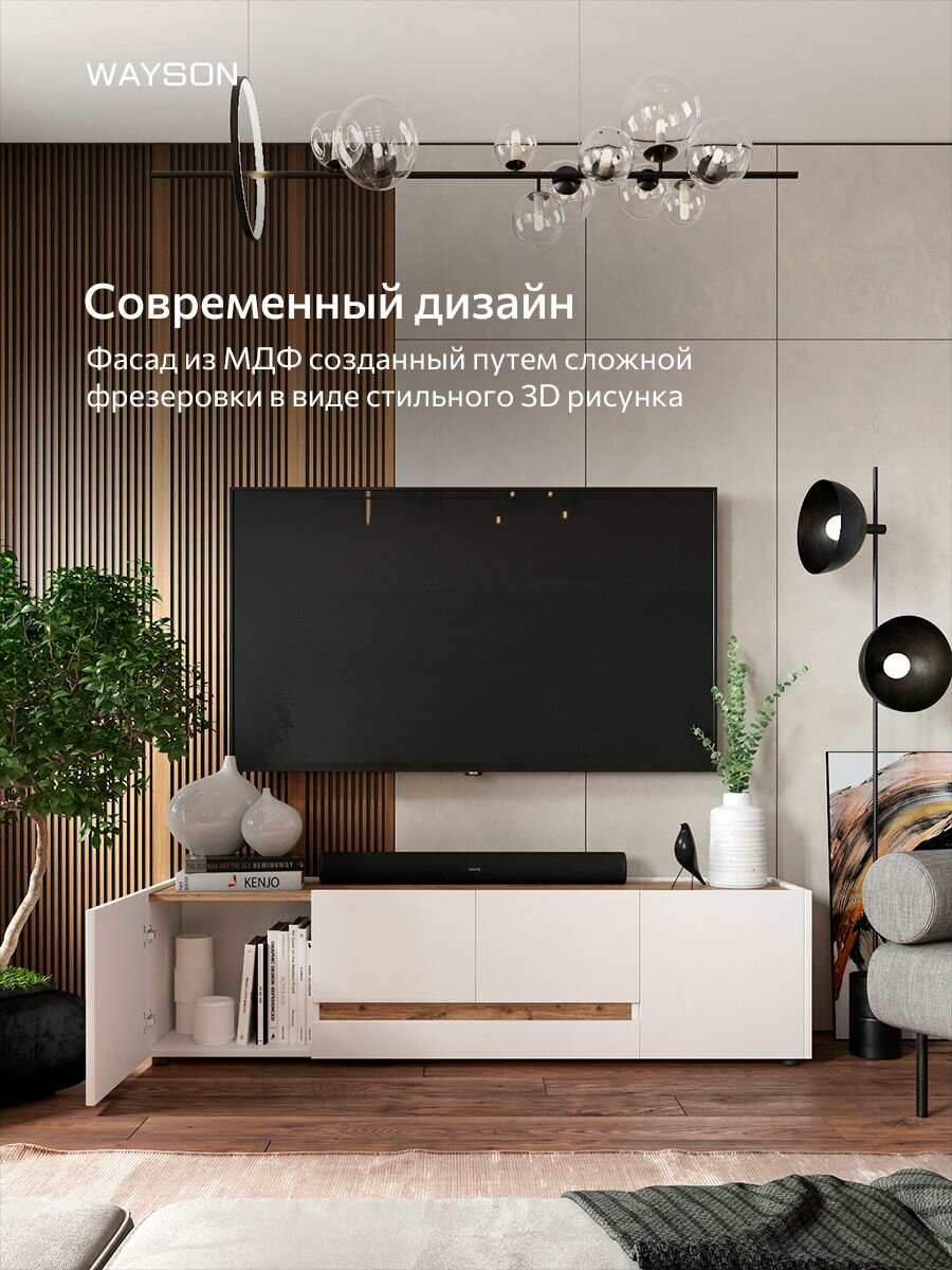 Тумба напольная под телевизор - станет идеальным дополнением вашего интерьера, добавит стиль и функциональность. Тумба под телевизор выполнена в современном дизайне и доступна в белом цвете, с добавление дерева, что позволяет легко вписать её в любой интерьер. Тумбочка под телевизор располагает достаточным пространством для размещения телевизора и других аксессуаров. Тумба под ТВ "Сити" не только красиво смотрится, но и обладает высокой прочностью благодаря качественным материалам. Тумба для телевизора станет центром внимания в вашей гостиной, а ее функциональность позволит вам легко поддерживать порядок.
