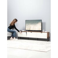 Особенность данной модели заключается в её универсальности - тумба может быть установлена как напольным вариантом, так и в качестве подвесной консоли. Благодаря своей длине и продуманной конструкции с закрытыми и вместительными полками, она обеспечивает оптимальное хранение различных предметов.