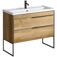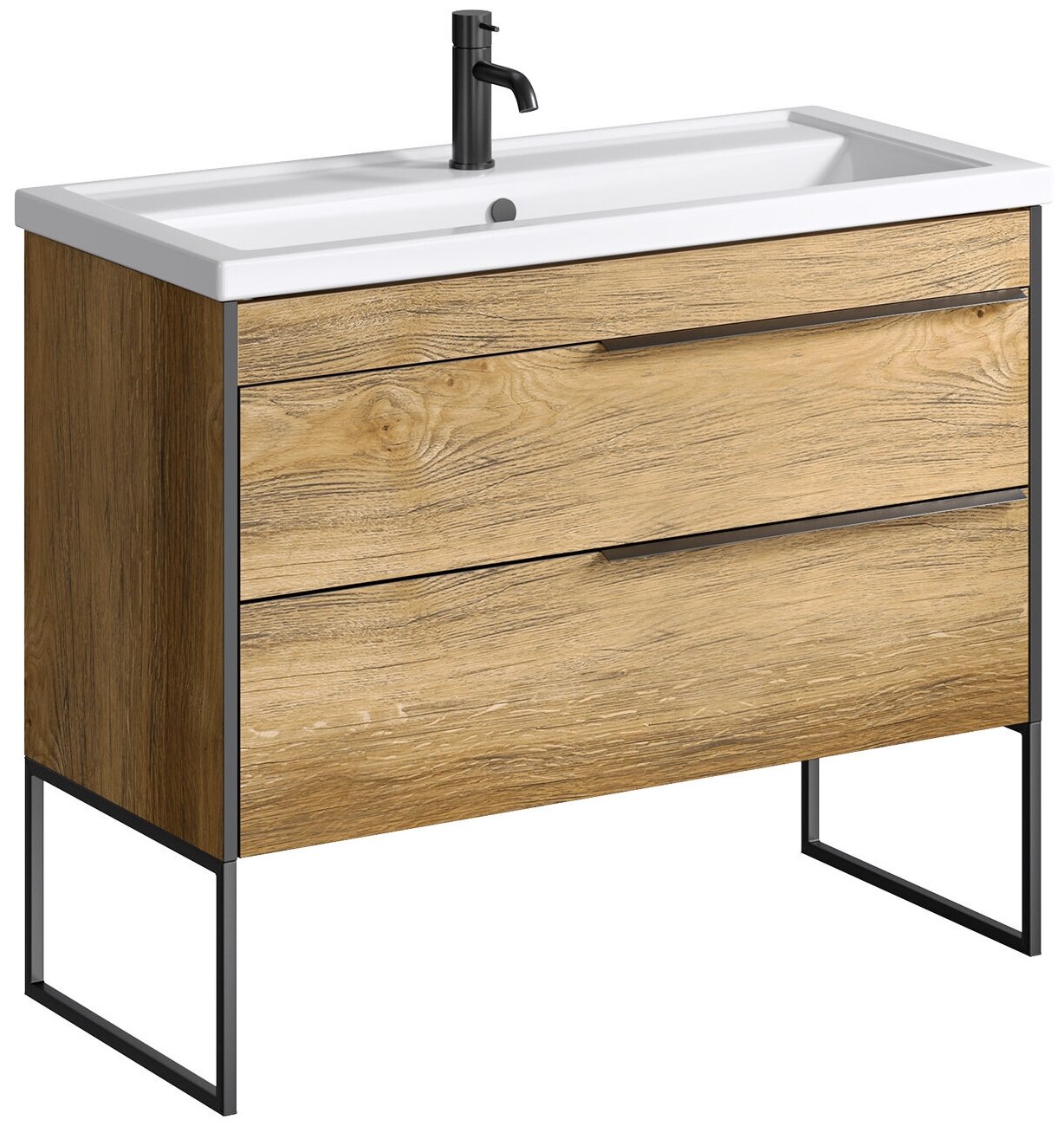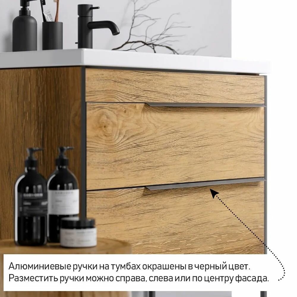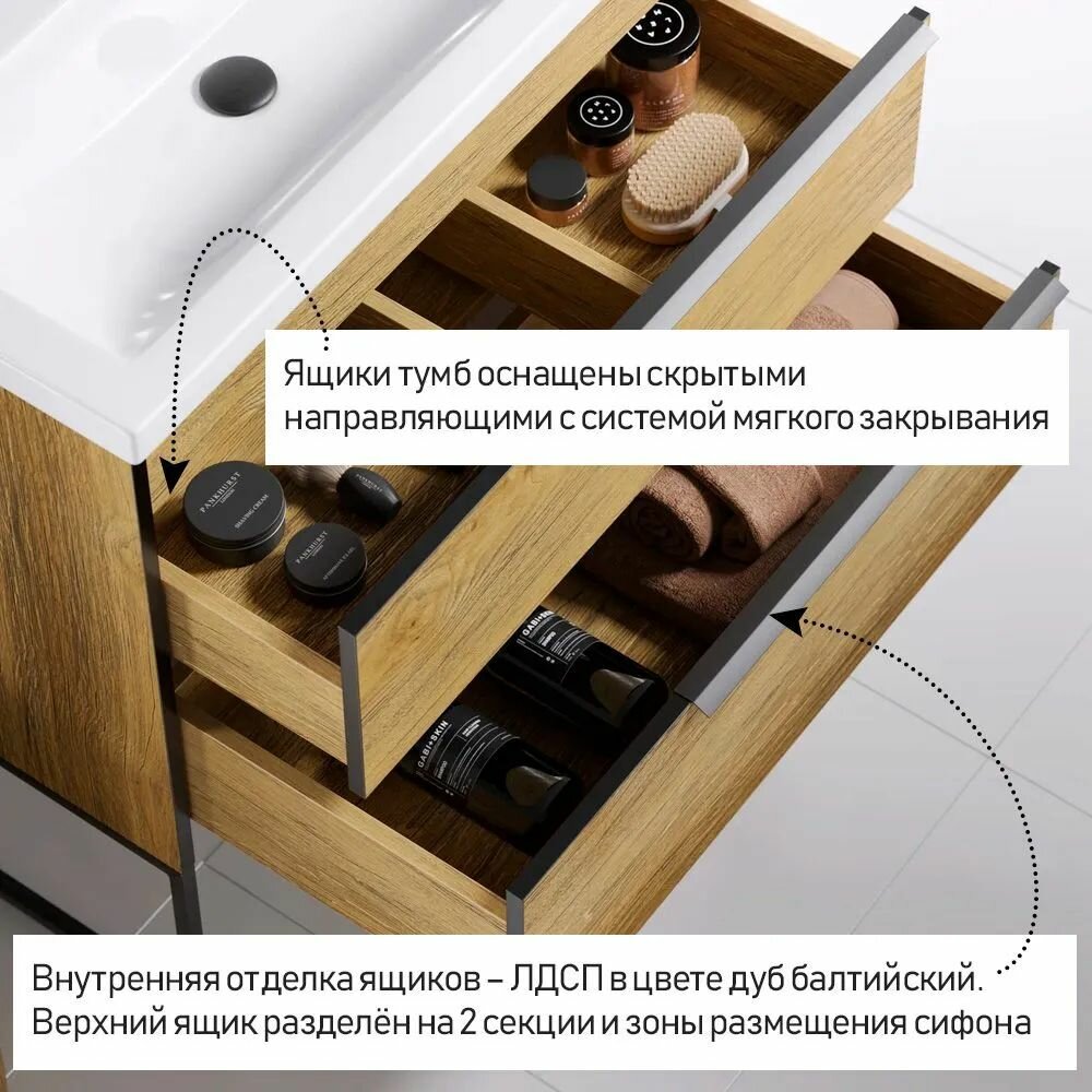 Подвесная тумба с двумя ящиками для комплектации с умывальником Фостер 1000 (4640021065204) Фасады и корпус выполнены из ЛДСП (древесностружечной плиты повышенной плотности) в цвете дуб балтийский, кромка матового черного цвета; Тумбы поставляются в подвесном исполнении с двумя ящиками, однако при монтаже гарнитур можно сделать напольным. Для этого необходимо добавить в набор ножки необходимого размера. Ножки металлические и окрашены в черный цвет (артикул ножек - FRGN440); Алюминиевые ручки на тумбах также окрашены в черный цвет. Разместить ручки можно справа, слева или по центру фасада; Ящики тумб оснащены скрытыми направляющими австрийской фирмы Blum с системой мягкого закрывания (на которые производитель дает вечную гарантию); Внутренняя отделка ящиков – ЛДСП в цвете дуб балтийский; Тумба оснащена итальянскими навесами Camar, которые выдерживают нагрузку до 200 кг; Умывальник не входит в комплект поставки.