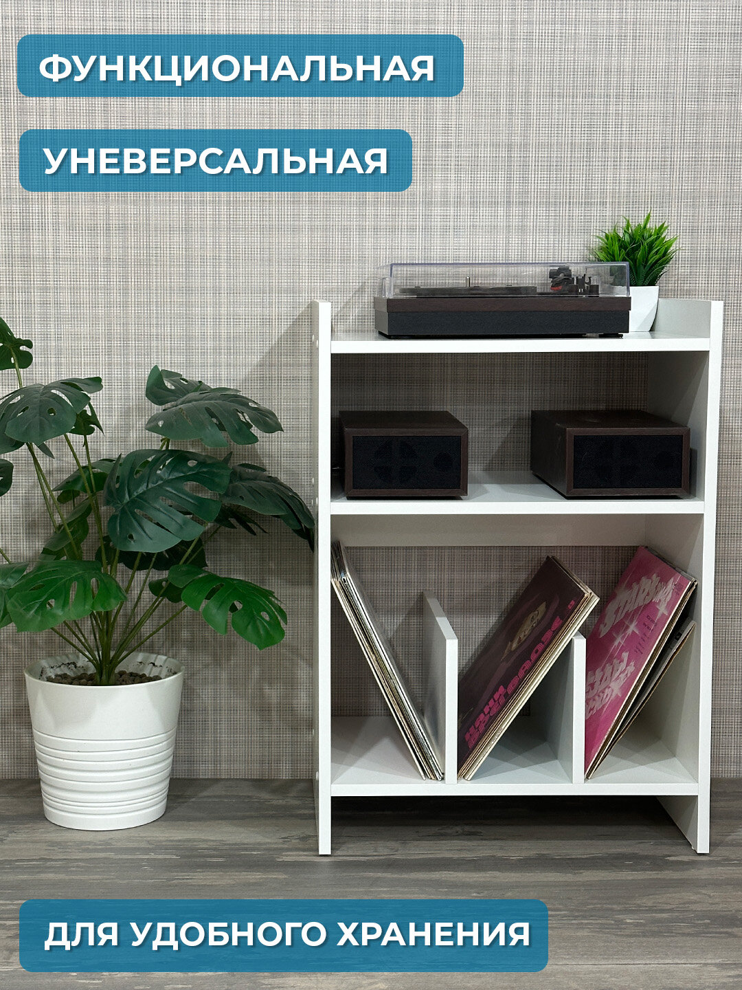 Преимущества: - Эргономичный дизайн с продуманной организацией пространства - Надежная конструкция гарантирует устойчивость всей системы - Вертикальное хранение пластинок защищает их от деформации и повреждений