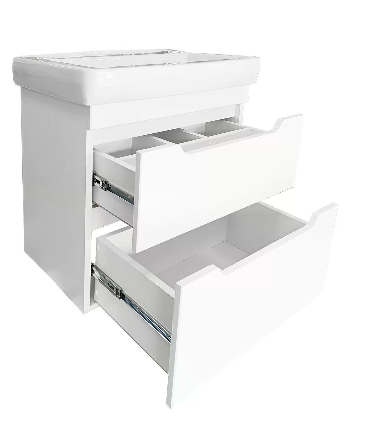 Два выдвижных ящика: Тумба оснащена двумя выдвижными ящиками, что позволяет удобно хранить различные предметы, такие как мыло, зубные щетки и другие аксессуары. Ящики оснащены шариковыми направляющими, обеспечивающими плавное и бесшумное открывание.