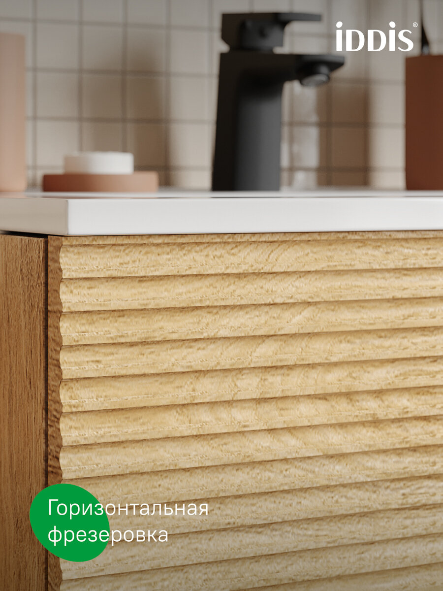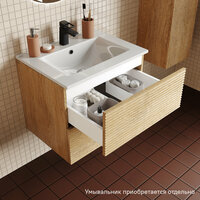 Компактная подвесная тумба для ванной комнаты Bild – красивый дизайн со структурной горизонтальной фрезеровкой в сочетании с теплым оттенком дуба, удобством и практичностью.