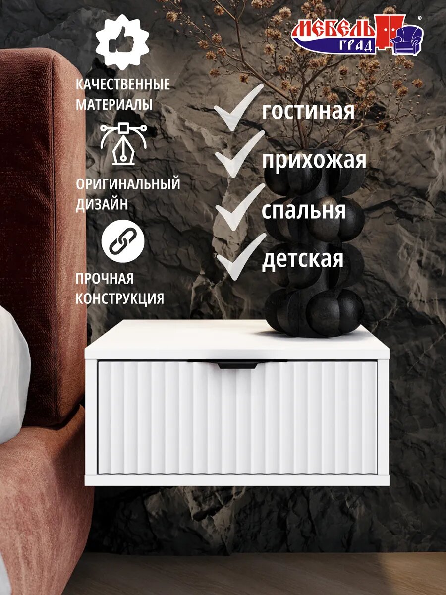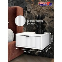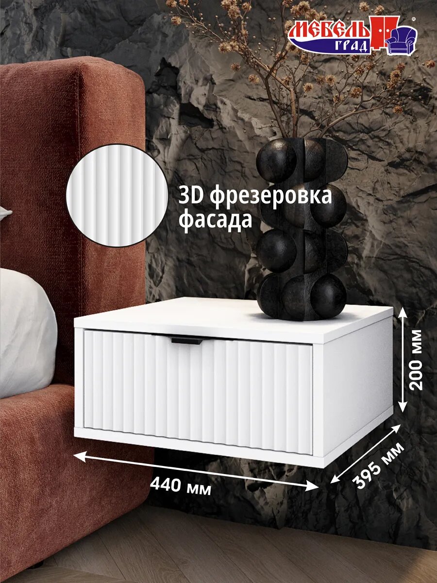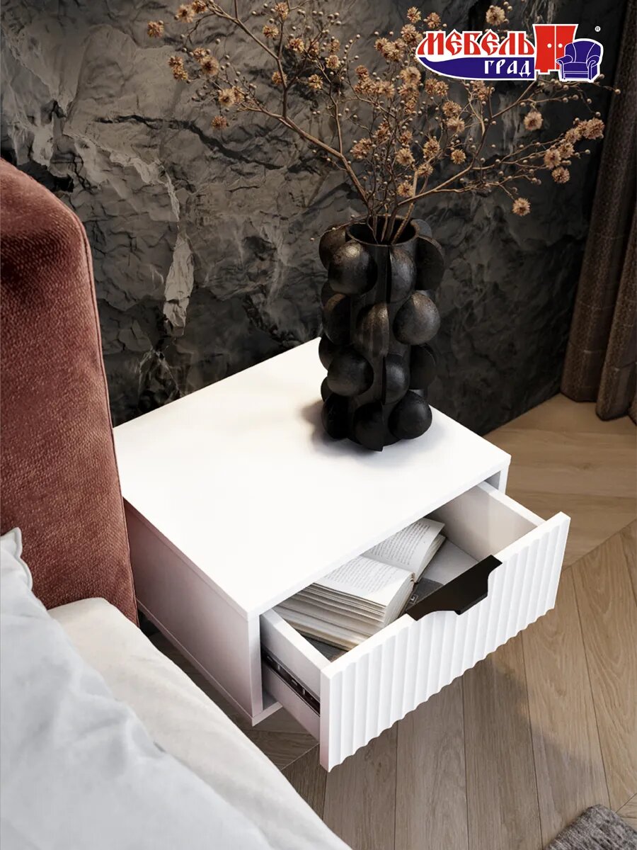 Тумба прикроватная Хлоя от Мебельград - стильное и функциональное решение для организации пространства в спальне, прихожей или салоне красоты. Изготовленная из прочного ЛДСП с фасадом из фрезерованного МДФ, тумба отличается лаконичным дизайном и надежностью. Тумба навесная оснащена одним вместительным ящиком на шариковых направляющих, обеспечивающих плавный и бесшумный ход при открывании и закрывании. Шариковые направляющие также защищают ящик от перекосов и обеспечивают его легкое выдвижение даже при полной загрузке. Благодаря "парящей" конструкции тумба визуально расширяет пространство, создавая ощущение легкости. Тумба подвесная поставляется в разобранном виде, что упрощает транспортировку и позволяет сэкономить место. Прикроватная тумба представляет собой идеальное сочетание стиля, практичности и инноваций. Тумба белая станет универсальным элементом любого интерьера. Белый цвет визуально расширяет пространство и добавляет света, что особенно важно для спальни. Лаконичный дизайн с минималистичными линиями позволяет тумбе гармонично вписаться в любой стиль помещения – от классического до современного. Одним из главных преимуществ тумбы с ящиком является её компактный размер. Это особенно актуально для небольших спален или комнат с ограниченным пространством. При этом тумба прикроватная узкая остаётся функциональной и вместительной благодаря продуманной конструкции. Парящая прикроватная тумба – это не просто предмет мебели, а настоящее произведение дизайнерского искусства. Благодаря особой конструкции крепления к стене создается впечатление, что тумба буквально парит в воздухе, не занимая лишнего пространства. Материалы, используемые при производстве тумбы, соответствуют экологическим стандартам и безопасны для здоровья. Процесс сборки интуитивно понятен и не требует специальных инструментов. Подробная инструкция и все необходимые крепежные элементы входят в комплект.
