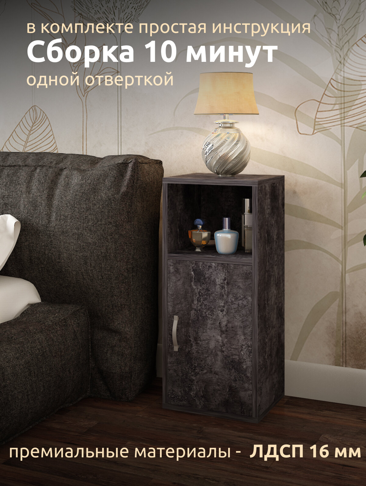 Тумба изготовлена из высококачественного ЛДСП, который обеспечивает прочность и долговечность изделия. Цвет тумбы – темно-серый, что придает ей современный и стильный вид.