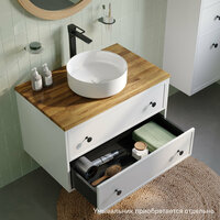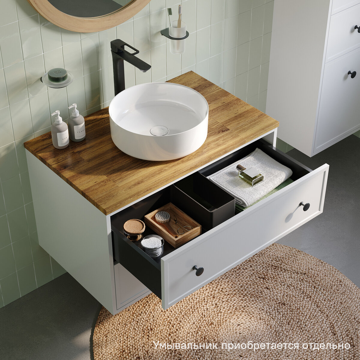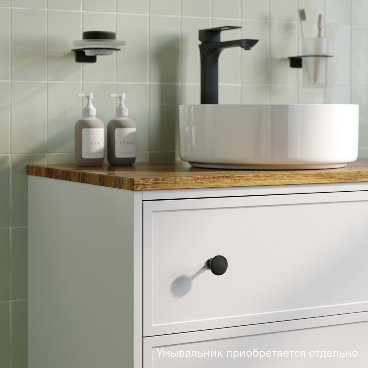 Чёрные матовые ручки, накладной умывальник, ящики с механизмом плавного доведения