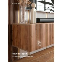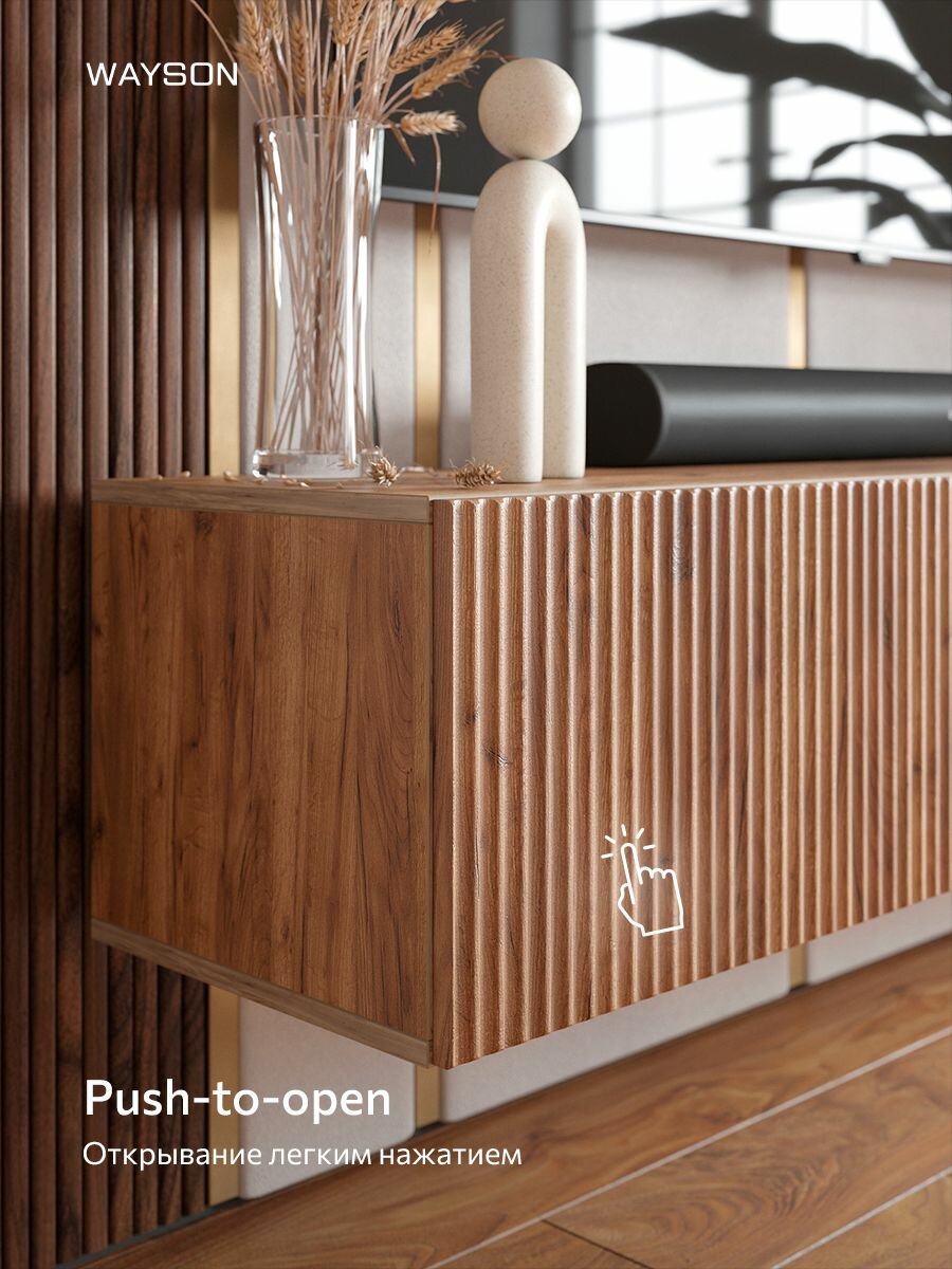 Эта тумба под TV имеет современный дизайн, имитирующий натуральное дерево, что добавит уют и атмосферу в вашем доме. Подвесная конструкция не только экономит пространство, но и создает эффект легкости в интерьере, позволяя визуально расширить его границы. Push-to-open механизм облегчает доступ к содержимому тумбы: для открытия дверцы достаточно легкого нажатия, что делает использование более комфортным.
