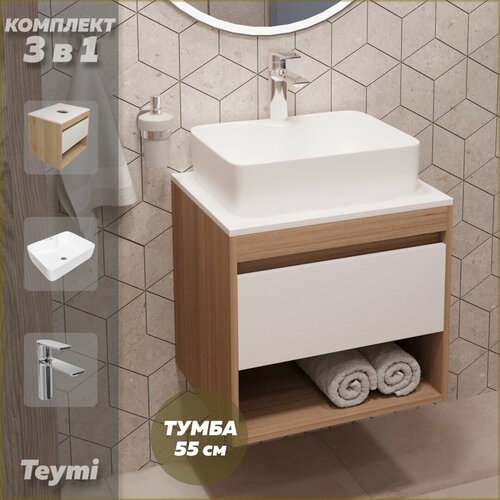 Купить Тумба подвесная с раковиной для ванной 55 см Teymi Ritta корпус дуб фасад белый раковина Helmi S 48 смеситель хром F03634 с доставкой по всей России.