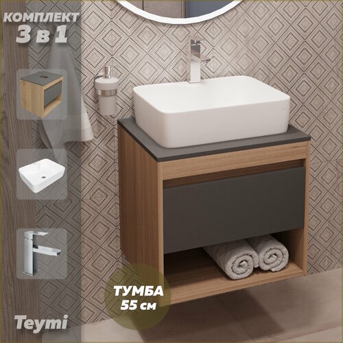 Купить Тумба подвесная с раковиной для ванной 55 см Teymi Ritta корпус дуб фасад графит раковина Helmi S 48 смеситель хром F03782 с доставкой по всей России.