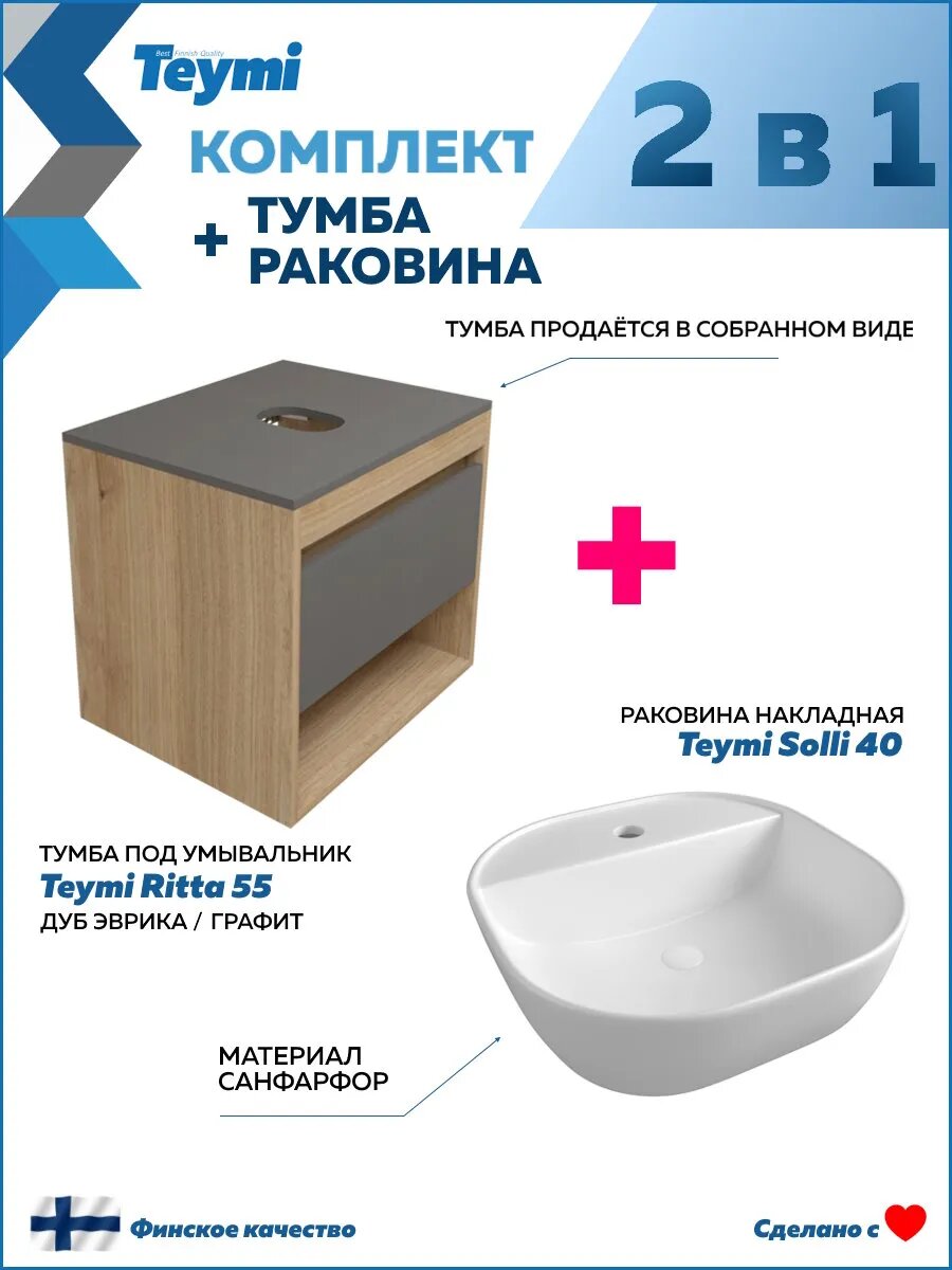 Купить Тумба подвесная с раковиной для ванной 55 см Teymi Ritta корпус дуб фасад графит раковина Solli 40 F03323 с доставкой по всей России. Тумба подвесная с раковиной для ванной 55 см Teymi Ritta корпус дуб фасад графит раковина Solli 40 F03323: сравнение цен, характеристики, фото, актуальное наличие и цены.