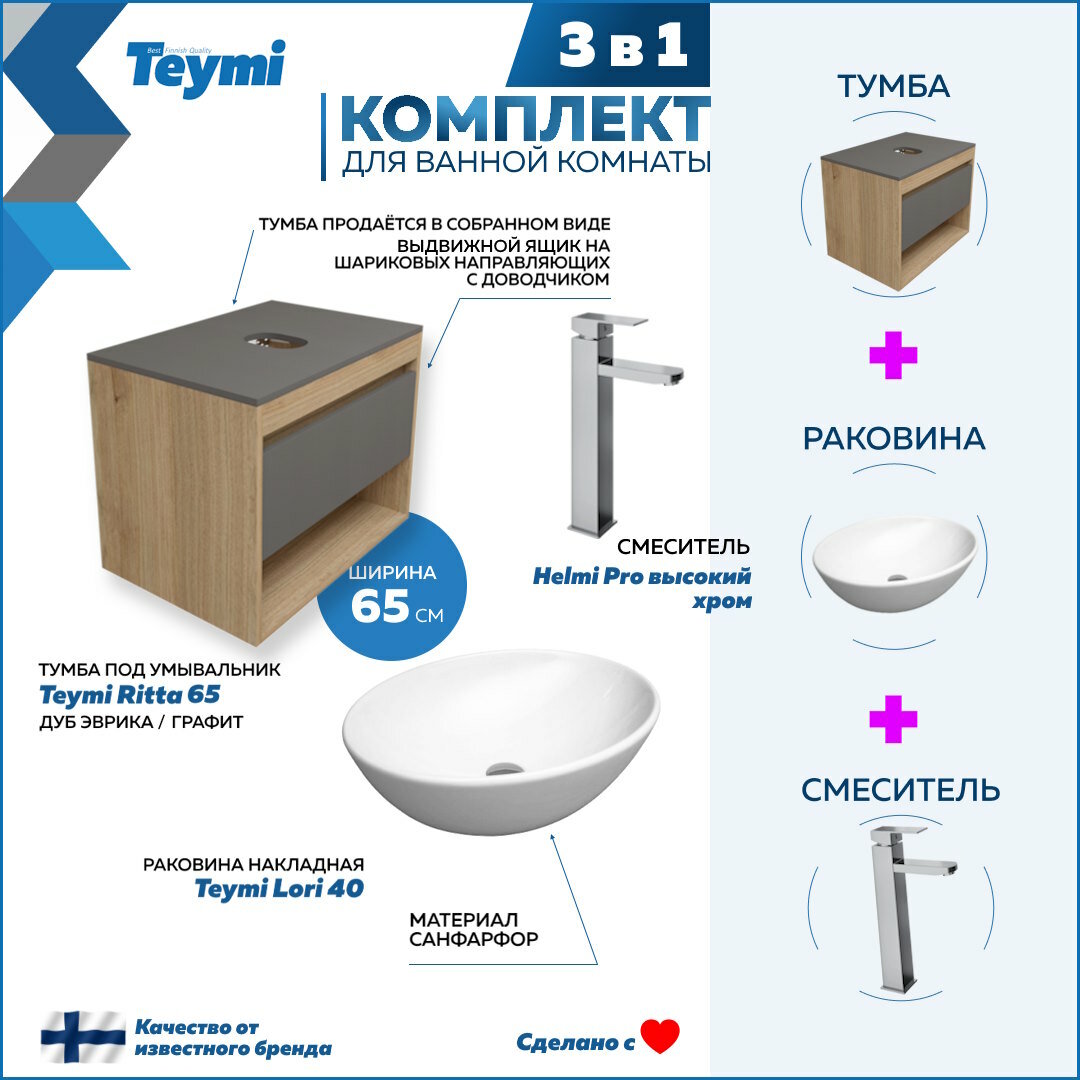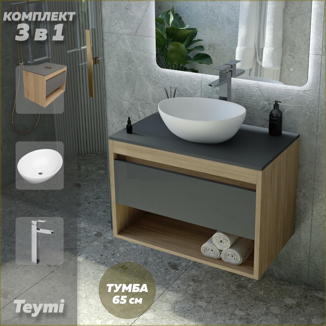 Купить Тумба подвесная с раковиной для ванной 65 см Teymi Ritta корпус дуб фасад графит раковина Lori 40 смеситель хром F09082 с доставкой по всей России. Тумба подвесная с раковиной для ванной 65 см Teymi Ritta корпус дуб фасад графит раковина Lori 40 смеситель хром F09082: сравнение цен, характеристики, фото, актуальное наличие и цены.