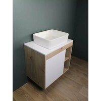 Характеристики: -- Артикул производителя: T60528; -- Серия / коллекция: Nura; -- Модель: Nura 70; -- Тип изделия – тумба под умывальник; -- Форма мебели – прямоугольная; -- Требуется сборка – нет, продаётся в собранном виде; -- Область применения – ванная комната; -- Система хранения – полка, полка с дверцей; -- Наличие доводчика – да; -- Количество полок – 2; -- Количество дверей – 1; -- Ширина – 700 мм; -- Глубина – 450 мм; -- Высота – 620 мм; -- Вес брутто – 27,4 кг; -- Тип установки – подвесной на стену; -- Стиль дизайна – лофт; -- Основной материал фасада – МДФ; -- Покрытие фасада – плёнка ПВХ, матовое; -- Цвет фасада – белый; -- Основной материал столешницы – МДФ; -- Покрытие столешницы – плёнка ПВХ, матовое; -- Цвет столешницы – белый; -- Толщина столешницы – 16 мм; -- Диаметр отверстия под умывальник – 150 мм; -- Основной материал корпуса – ЛДСП; -- Покрытие корпуса – плёнка ПВХ, матовое; -- Цвет корпуса – светлое дерево; -- Гарантийный срок – 24 месяца; -- Страна производства – Россия; -- Страна бренда – Финляндия; -- Бренд – Teymi.