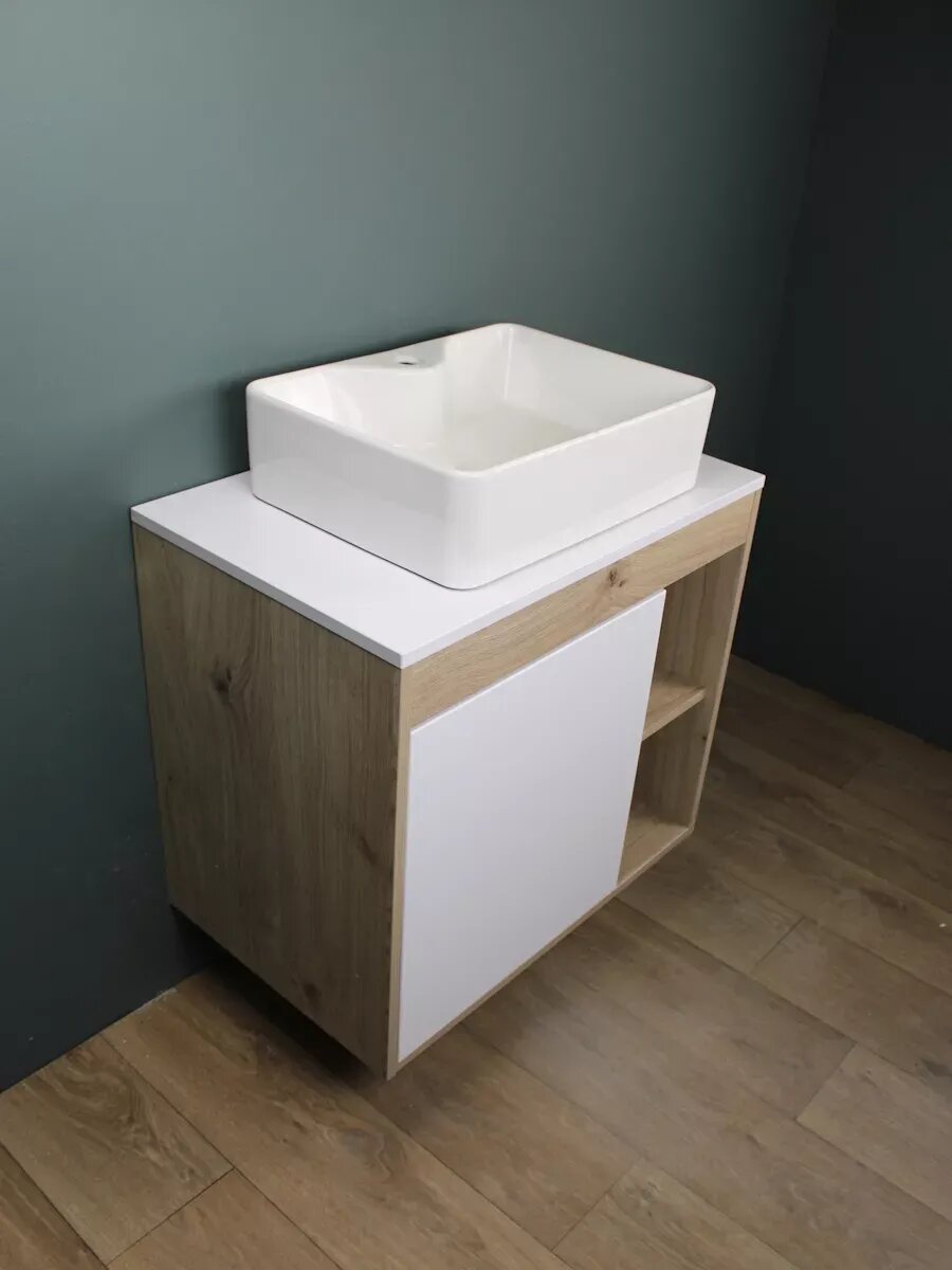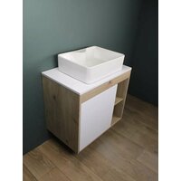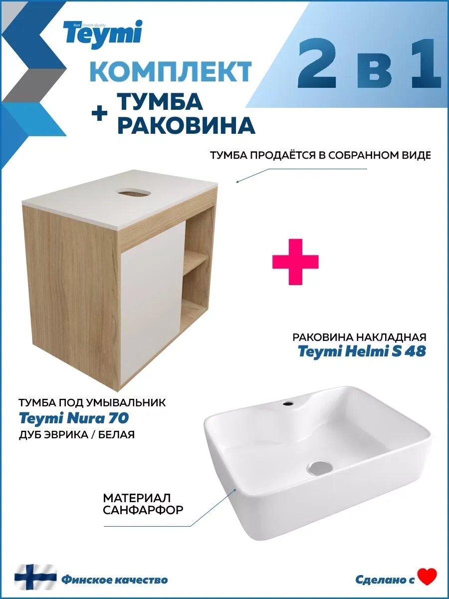 В комплект 2 в 1 входит: 1. Тумба подвесная Teymi Nura 70, дуб эврика/белый матовый. 2. Раковина накладная Teymi Helmi S 48 с полочкой под смеситель, белая.