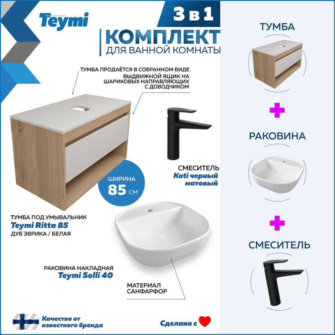 Купить Тумба подвесная с раковиной для ванной 85 см Teymi Ritta корпус дуб фасад белый раковина Solli 40 смеситель черный матовый F11844 с доставкой по всей России. Тумба подвесная с раковиной для ванной 85 см Teymi Ritta корпус дуб фасад белый раковина Solli 40 смеситель черный матовый F11844: сравнение цен, характеристики, фото, актуальное наличие и цены.