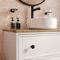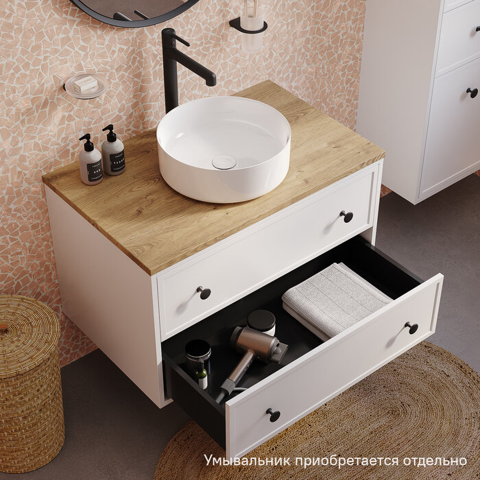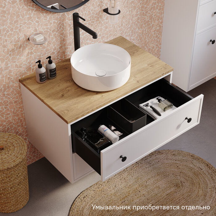 Чёрные матовые ручки, накладной умывальник, ящики с механизмом плавного доведения