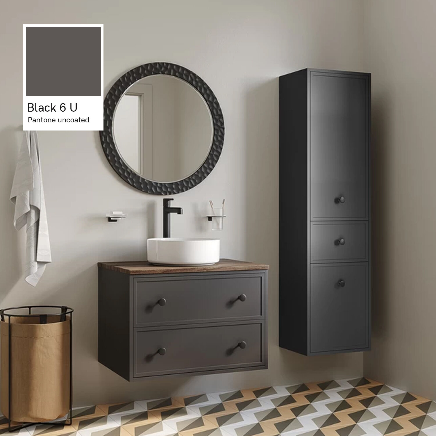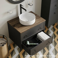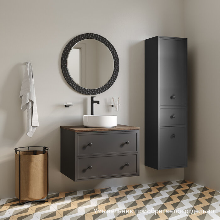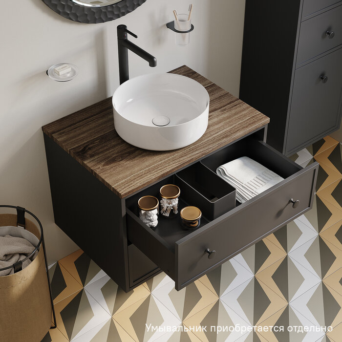 Чёрные матовые ручки, накладной умывальник, ящики с механизмом плавного доведения