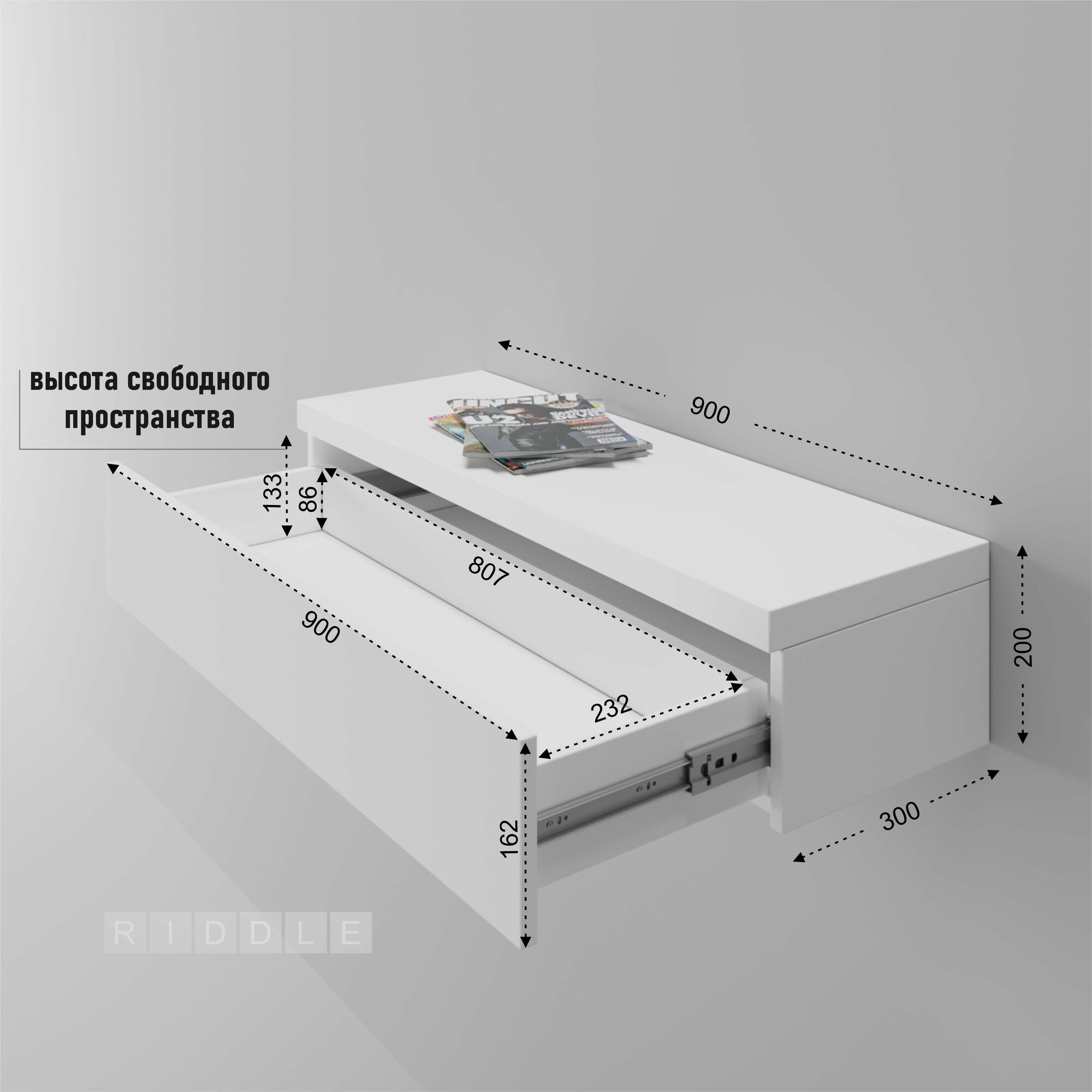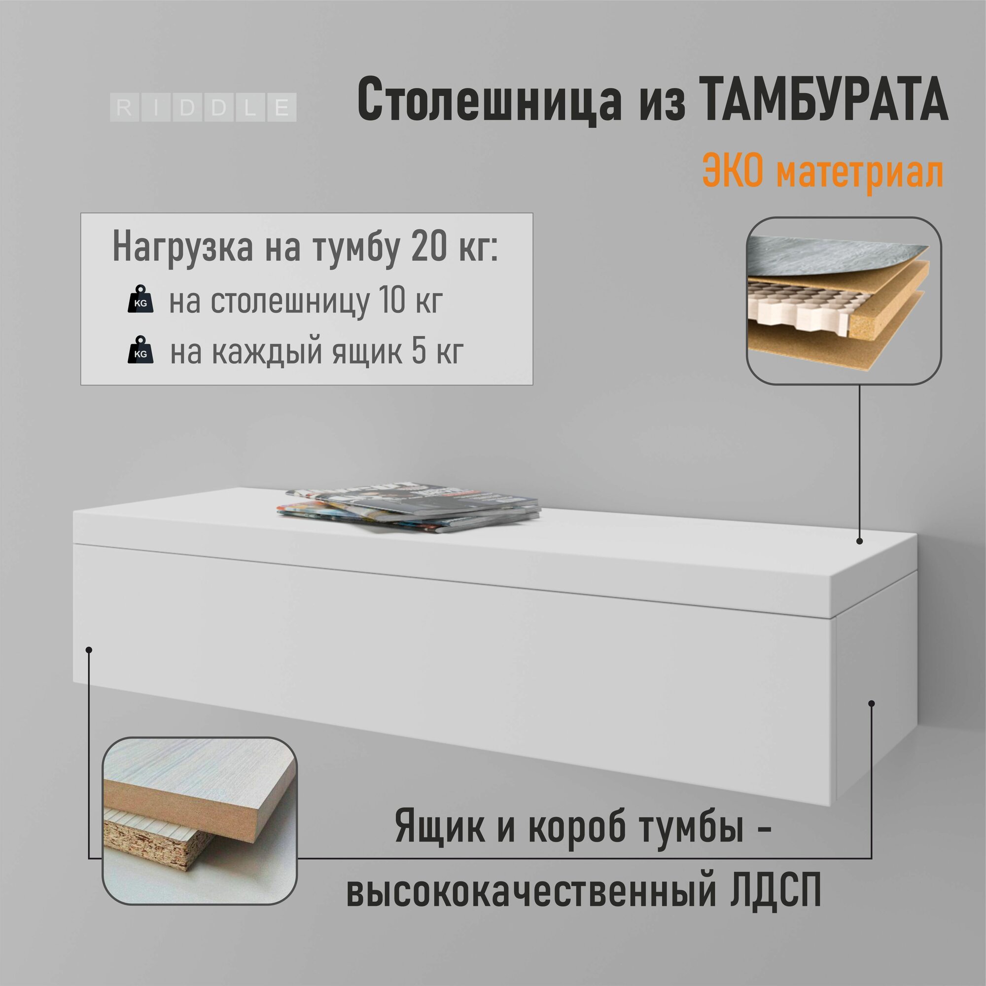 Ящик и корпус консоли выполнены из качественного ЛДСП, обеспечивая долгий срок службы изделия. Матовая поверхность придает тумбе стильный и современный вид, который легко впишется в интерьер вашего дома. Подвесная конструкция тумбы позволяет экономить место и делает ее идеальным решением для небольших помещений.