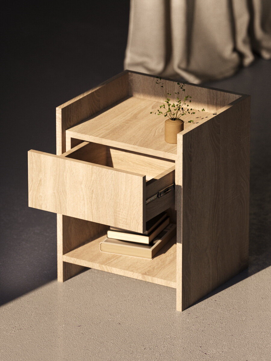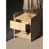 Тумба прикроватная - простая и функциональная прекрасно подойдет под любой интерьер. Тумба выполнена из ЛДСП 1 сорта класса Е1, оснащена выдвижным ящиком на бесшумных шариковых направляющих, в котором вы можете хранить любые необходимые мелочи. У тумбы отсутствует лицевая фурнитура, открытие за низ фасада ящика. В комплекте идет фурнитура для монтажа и инструкция по сборке.