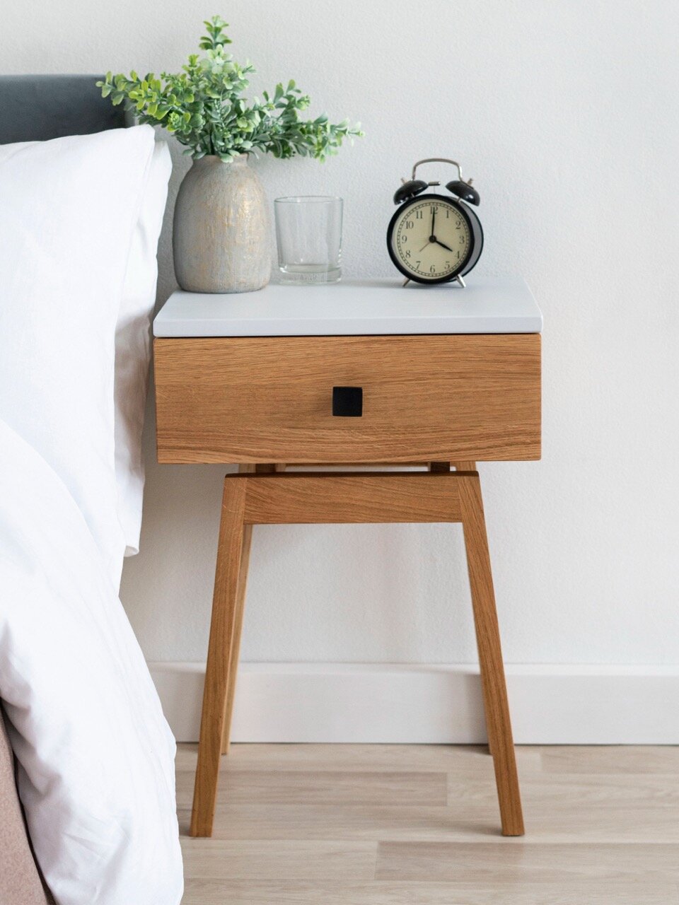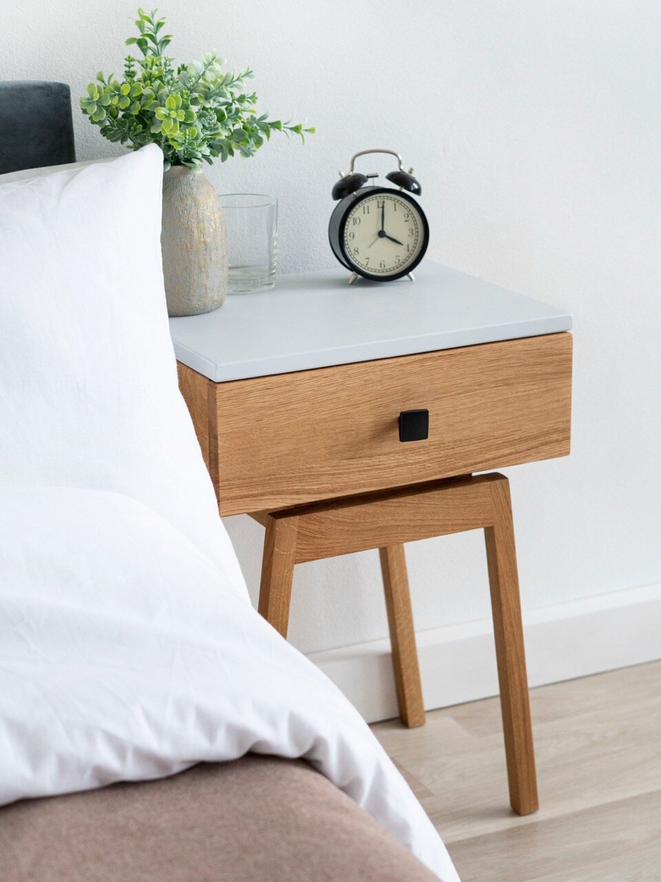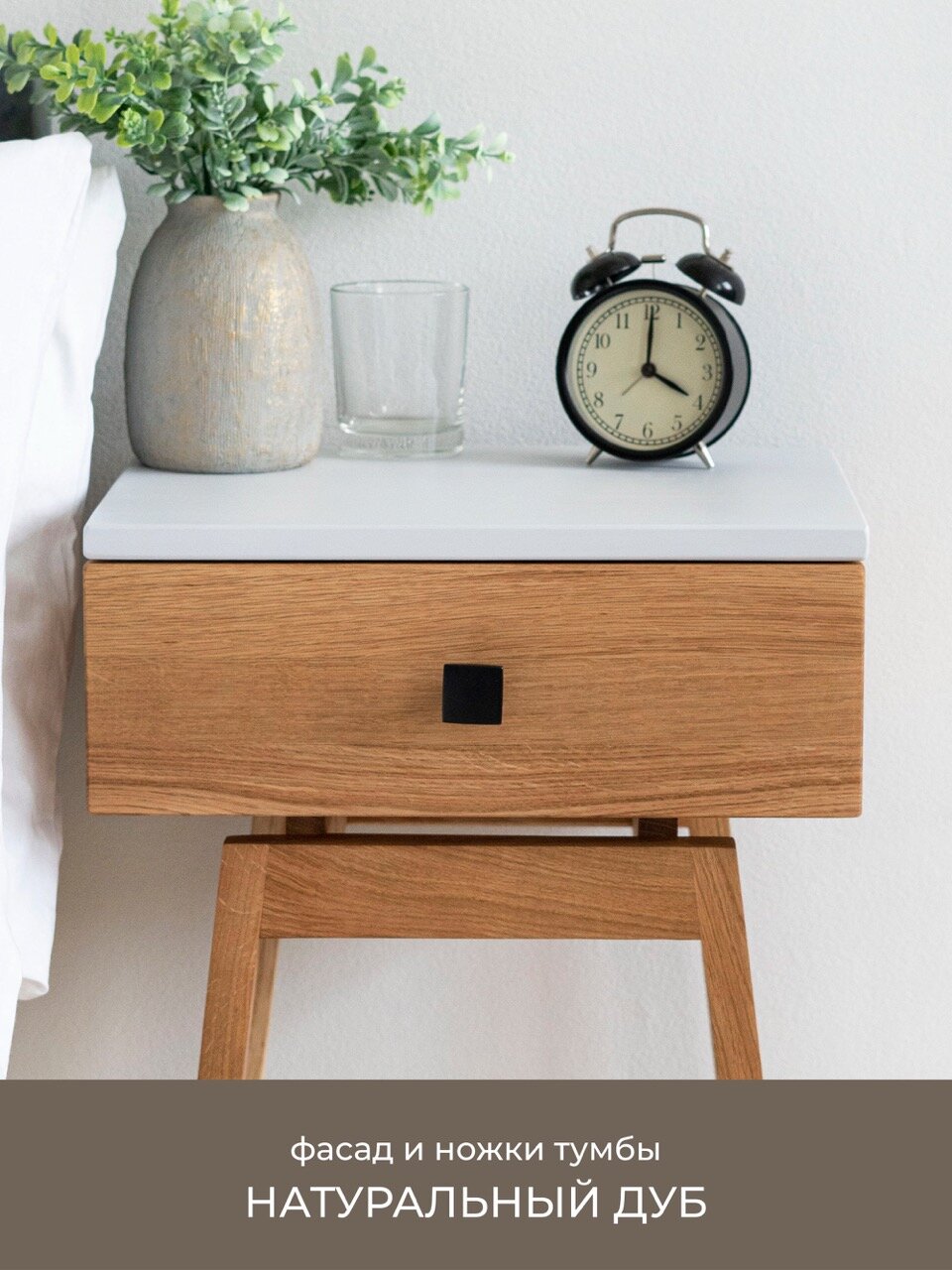 Сборка деревянной прикроватной тумбы занимает не более 10 минут, так как корпус уже собран. Ручная шлифовка всех элементов тумбы. Защита маслом всех поверхностей предотвращает попадание влаги и грибка. Можно протирать влажной и отжатой ветошью.