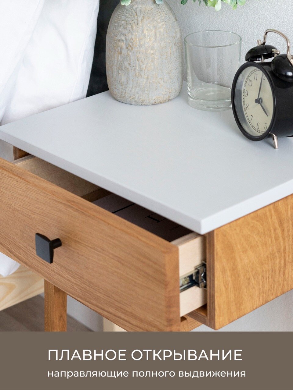 Фурнитура: установлена лаконичная черная ручка и шариковые направляющие для выдвижного ящика.