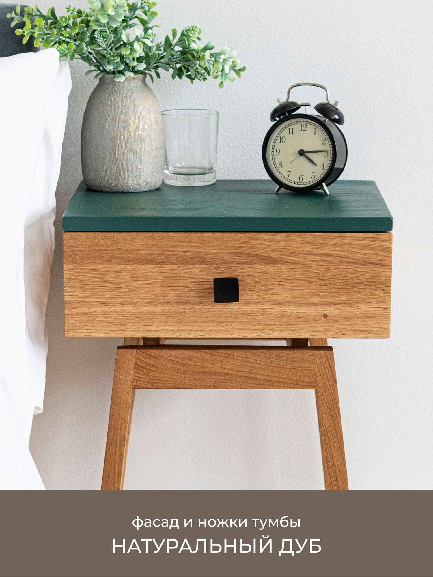 Сборка деревянной прикроватной тумбы занимает не более 10 минут, так как корпус уже собран. Ручная шлифовка всех элементов тумбы. Защита маслом всех поверхностей предотвращает попадание влаги и грибка. Можно протирать влажной и отжатой ветошью.
