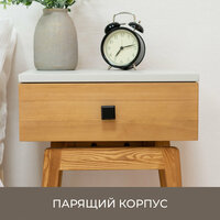 В комплекте деревянный корпус тумбы идет в собранном виде (неразборный), деревянные ножки в собранном виде, крепеж для сборки (4 болта, 4 самореза), мягкие подпятники