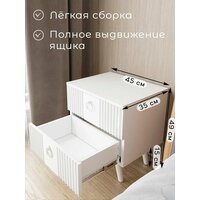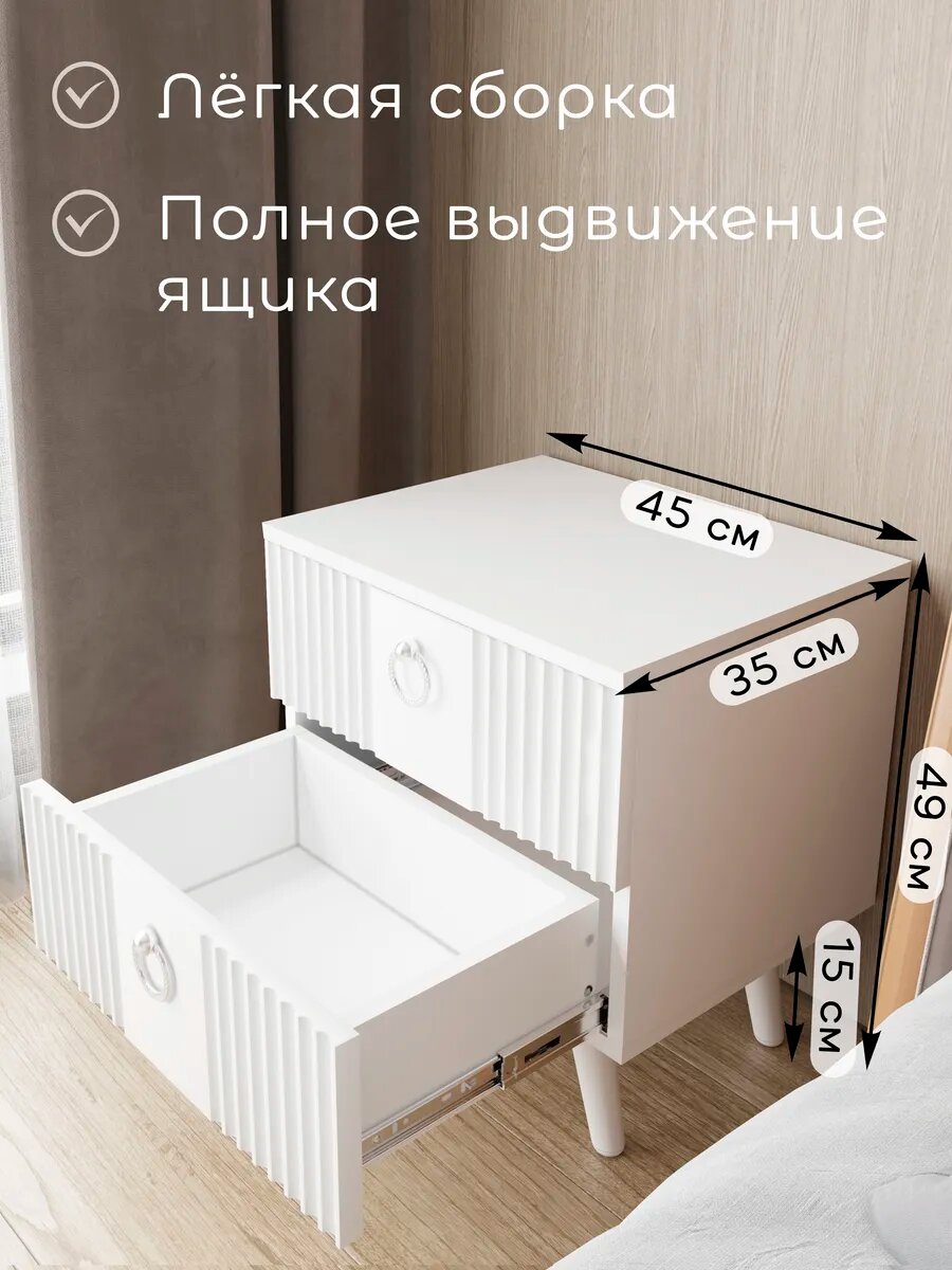 Тумба прикроватная на ножках - идеальное сочетание стиля и функциональности, отлично вписывается в любое помещение. Конусные деревянные ножки высотой 15 см - тумба с двумя ящиками и высотой 30 см - тумба с одним ящиком, которые обеспечивают устойчивость и надёжность. Благодаря шариковым направляющим, ящики открываются и закрываются бесшумно и плавно, что добавляет удобства в повседневном использовании. Тумбочка поставляется в разобранном виде. В комплекте с тумбочкой идет подробная схема сборки. Уникальная ручка кольцо не только прекрасно выглядит, но и удобно в использовании, придавая дополнительную изюминку общему дизайну. Фасад декорирован 3D-фрезеровкой, что создает эффект объёма и глубины, делает более заметным и выразительным современный стиль и высокое качество исполнения. Эта прикроватная тумба станет неотъемлемой частью вашего пространства, сочетая в себе эстетику и практичность, а её утонченный внешний вид обязательно привлечет внимание и восторженные взгляды гостей.