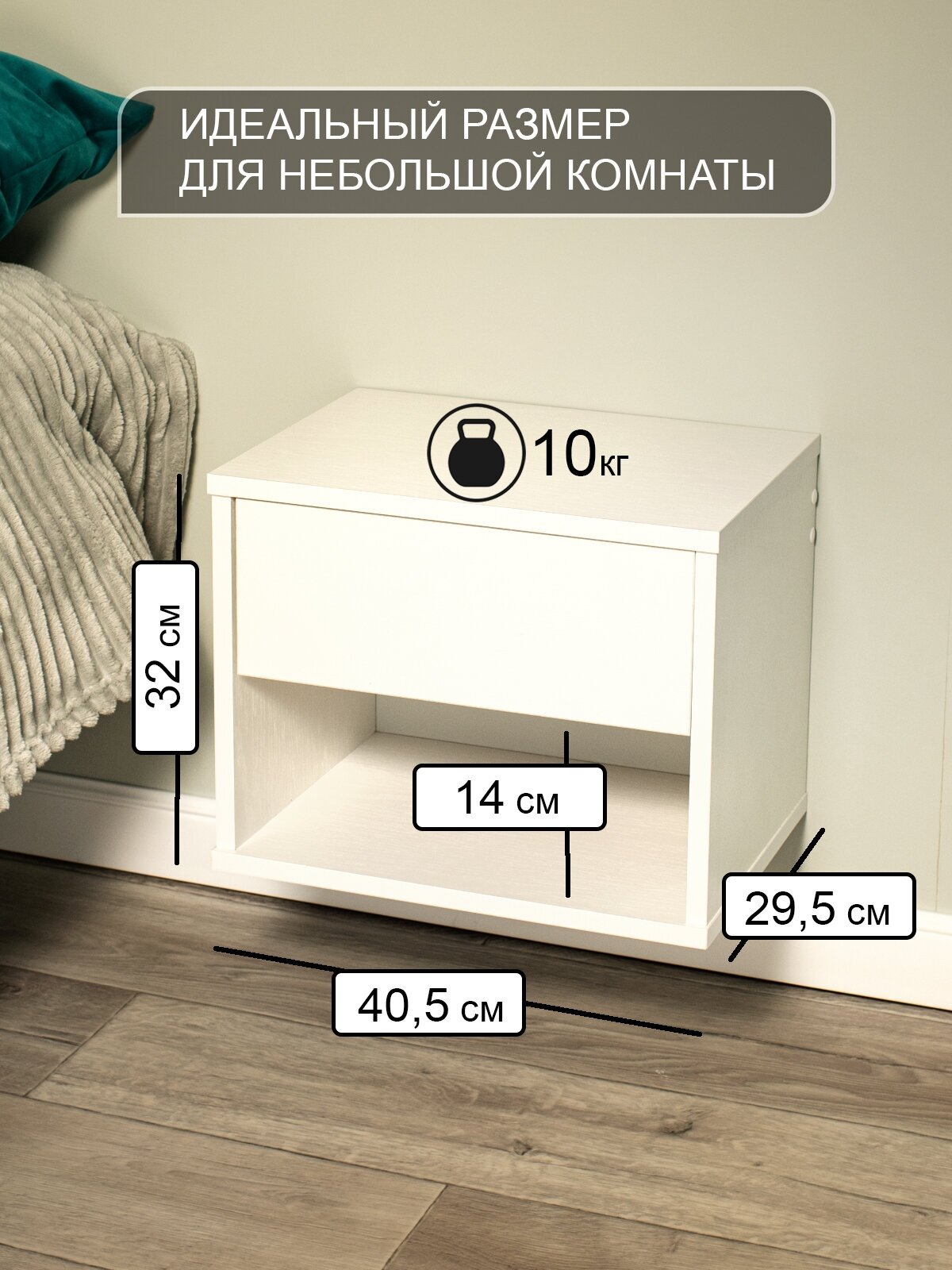 Делаете ремонт и ищите подходящую мебель для своей квартиры? Тогда обратите внимание на эту небольшую парящую тумбочку, которая прекрасно впишется в ваш интерьер. Она изготовлена из прочного качественного материала и прослужит очень долго, а минималистичный дизайн и универсальный однотонный цвет позволит ей гармонично смотреться в домах с разным стилем. Она вместительная, но достаточно компактная, поэтому считается идеальным вариантом для маленьких комнат. Низкая, аккуратная - она прекрасно разместится в гостиной и станет частью любой композиции, а в прихожей ее можно использовать для вещей, ключей и прочих мелочей, которые должны быть под рукой. Также данный навесной товар на стену пригодится в детской для хранения игрушек или для спальни в качестве туалетного столика. Ну а если вы приобретаете ее для офиса, она без проблем поместится под компьютерный стол. В комплекте идут все необходимые детали для сборки, которая не отнимет у вас много времени!