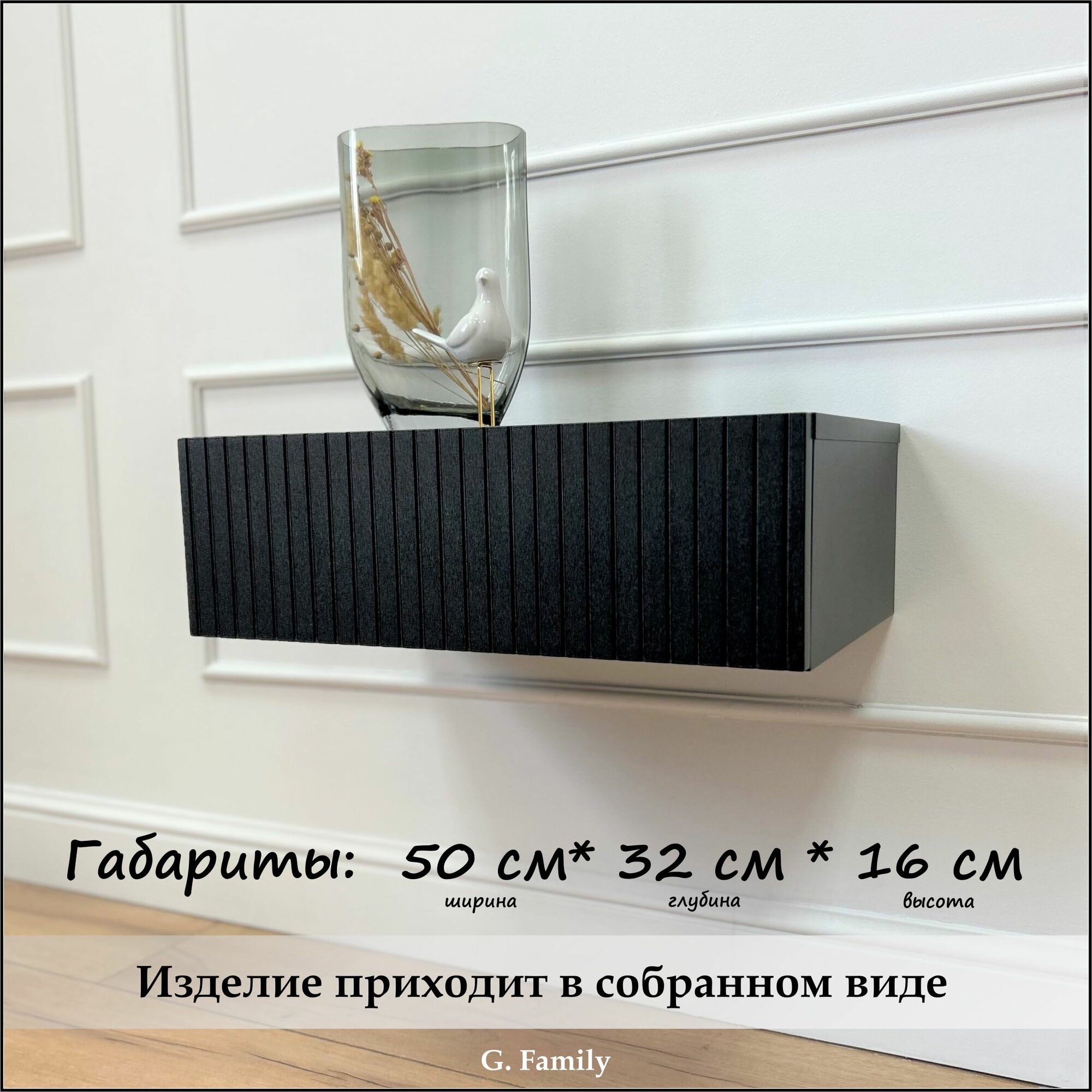 Стильный черный цвет и компактные размеры (ширина — 50 см, глубина — 32 см, высота — 16 см) делают её идеальным решением даже для самых небольших пространств. Максимальная нагрузка — 10 кг, что позволяет удобно хранить различные предметы и поддерживать порядок в комнате.