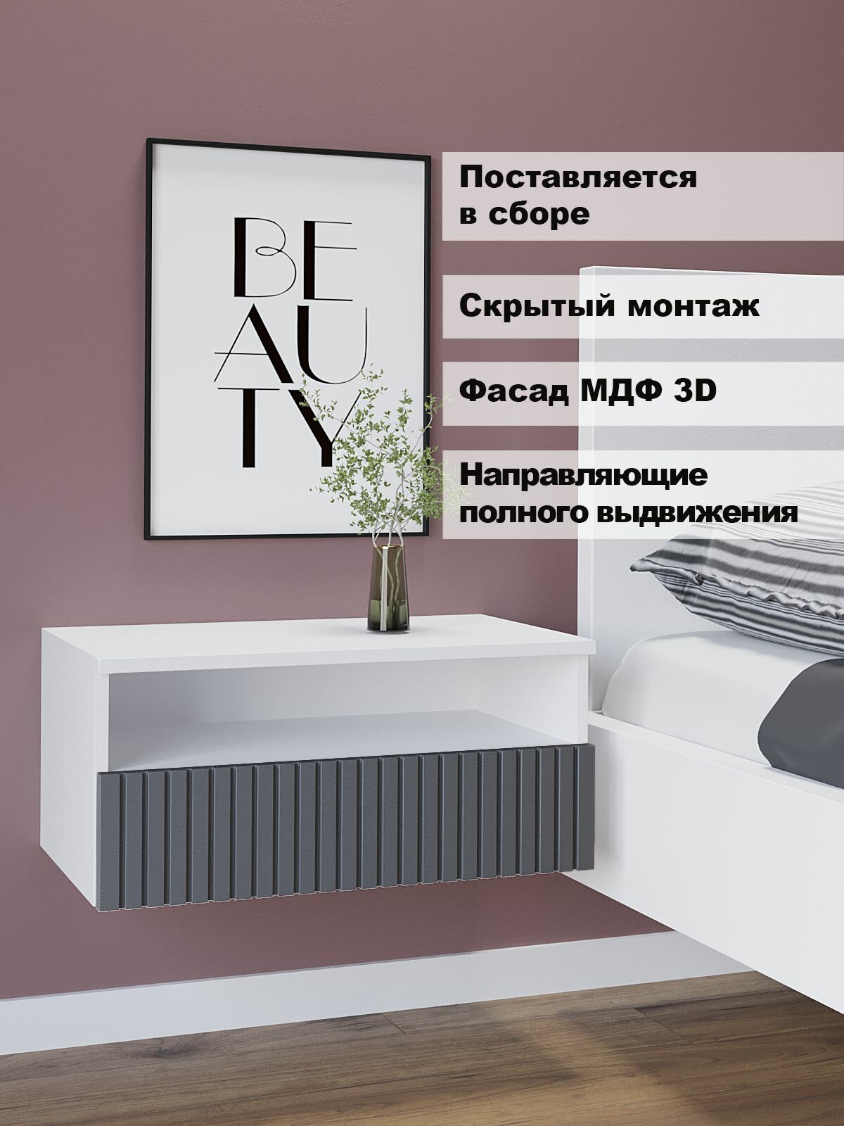 Тумба прикроватная подвесная Кросс, 52см х 30см х25см, Белый/Графит: сравнение цен, характеристики, фото, актуальное наличие и цены.