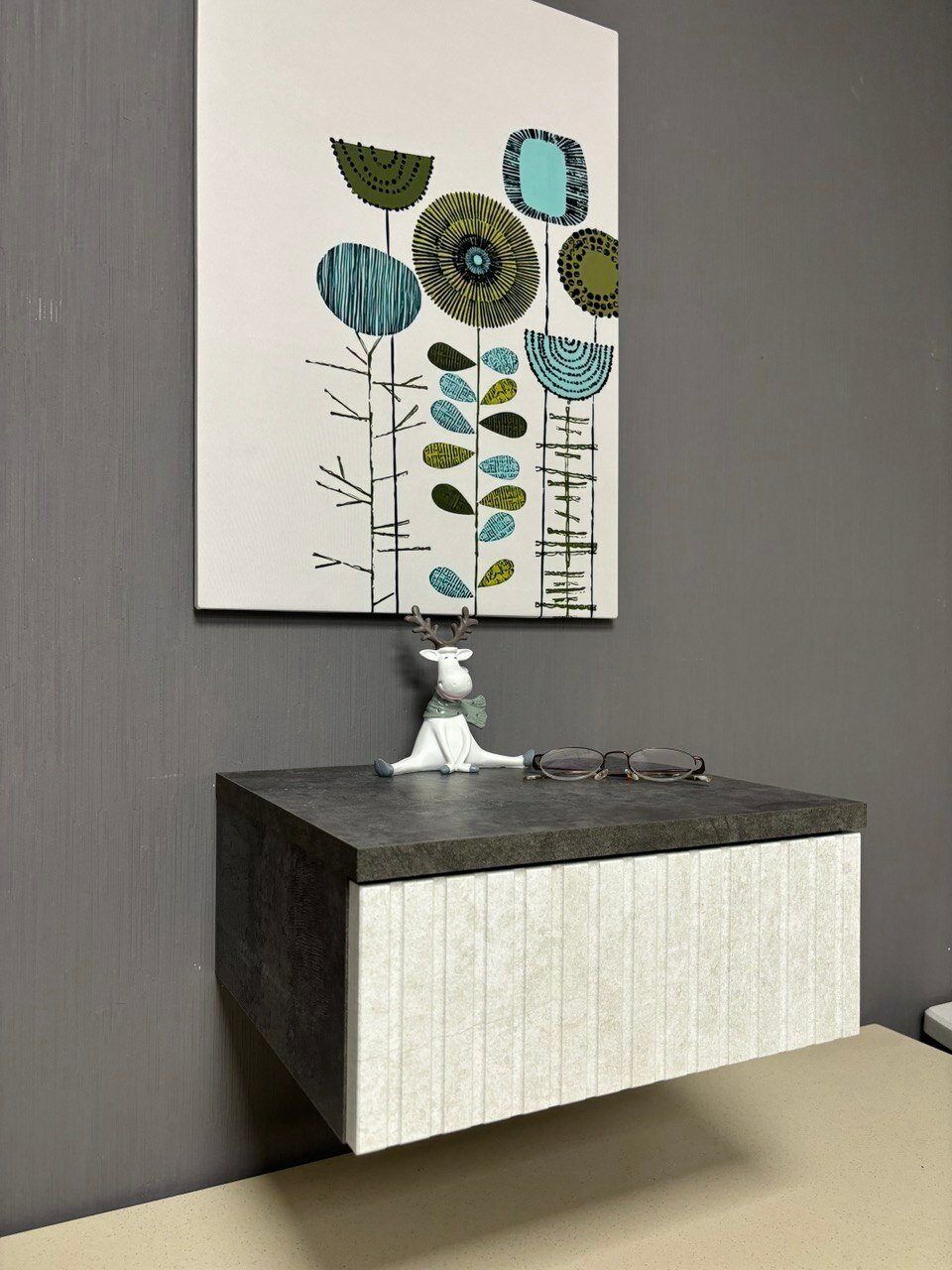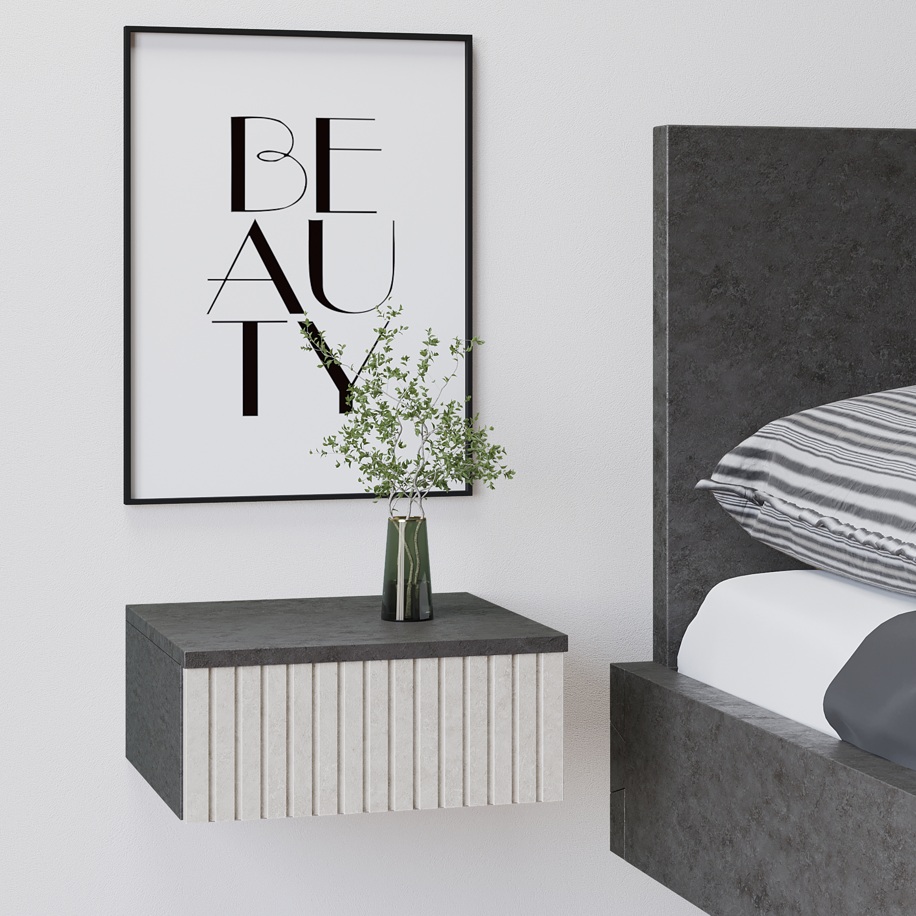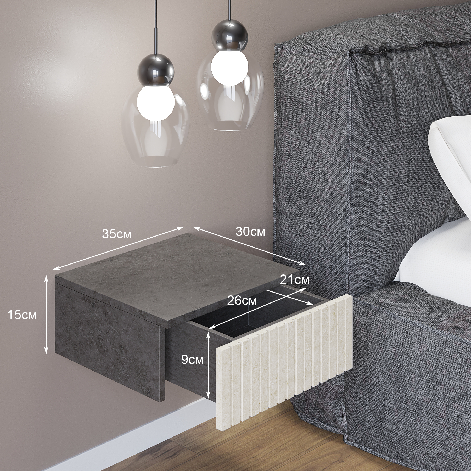 Подвесная прикроватная тумбочка в стильном и элегантном дизайне украсит интерьер Вашего дома и станет функциональным предметом мебели в гостиной, спальне, прихожей, на кухне или детской комнате. Навесная тумба изготовлена из высококачественного и экологически чистого ЛДСП с отделкой МДФ и покрыта защитным покрытием от царапин Soft touch. Оснащена вместительным ящиком, с бесшумными металлическими направляющими и надежной подвесной системой с креплением к стене. Тумбочку можно использовать как в спальне как прикроватный стол, так и как тумбу в прихожую или коридор, а в сочетании с зеркалом как туалетный стол, столик на балкон, в ванную или консоль. Навесная тумба не занимает много места и экономит пространство. Детальная и понятная инструкция по монтажу, а также фабричная сборка и крепления, прилагающаяся в комплекте, делают процесс установки легким и быстрым. Превосходный подарок на Новоселье.