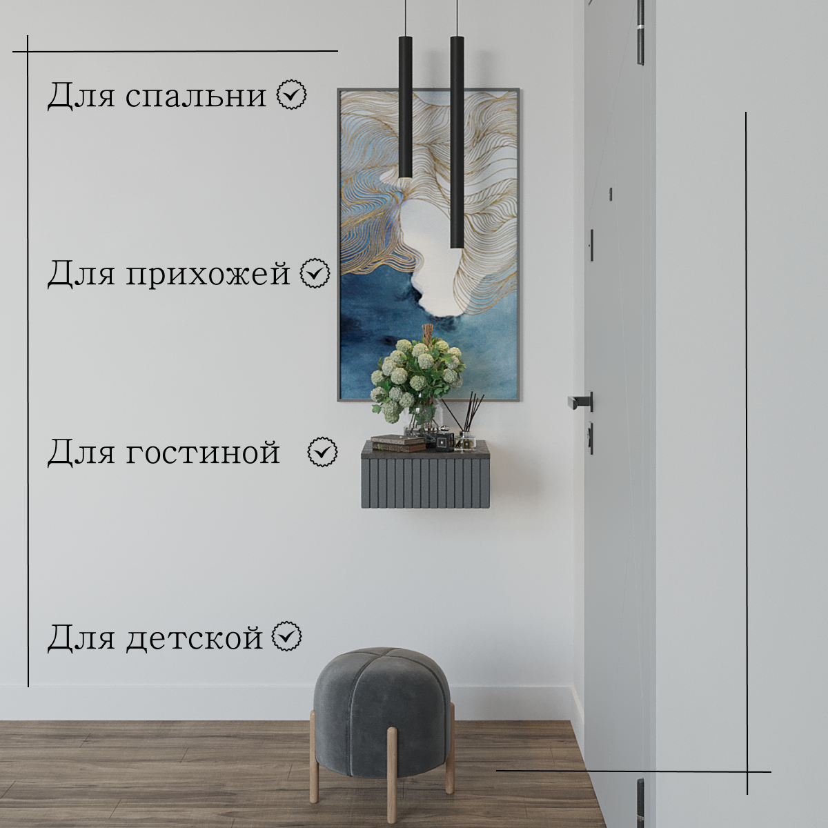 для ванной комнаты, для гостиной, для кухни, для прихожей, для спальни, прикроватная